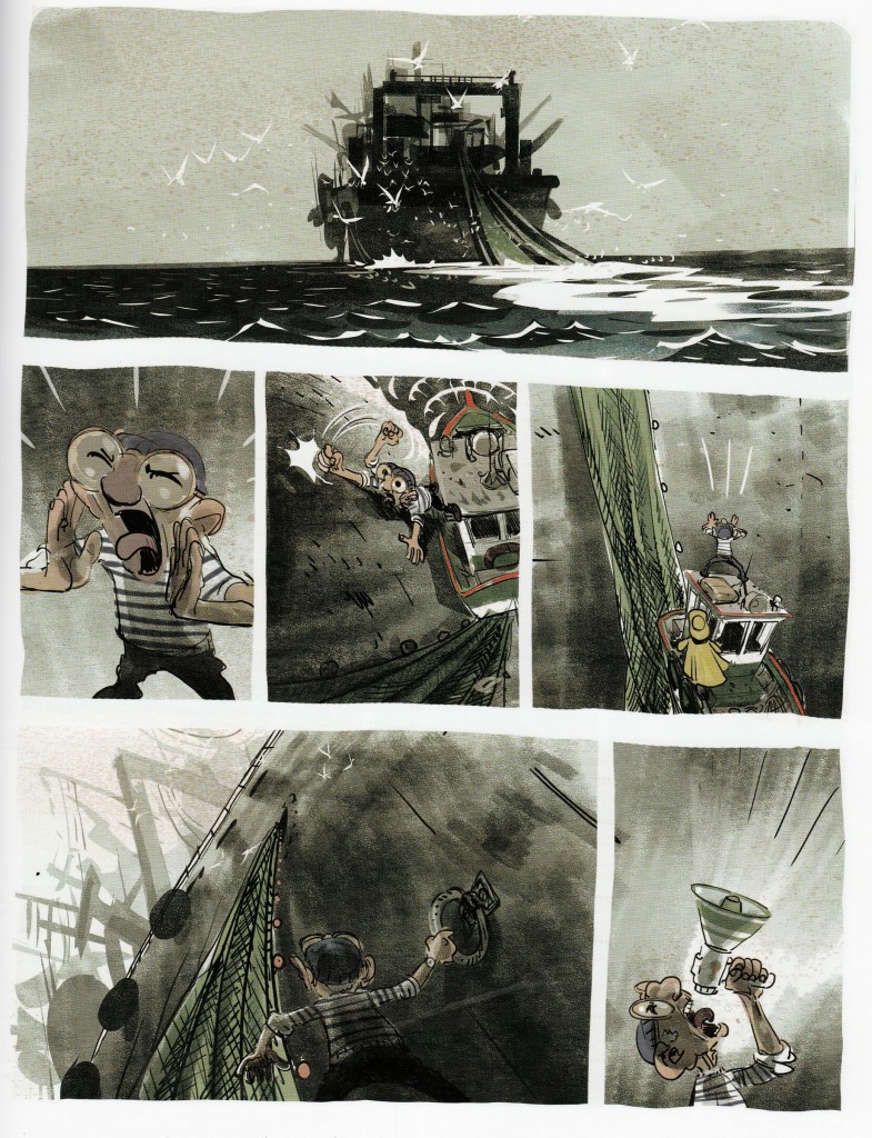 Résumé de l’éditeur : Chaque matin, Monsieur part pêcher au large des côtes bretonnes. Mais ce jour-là, c’est lui qui est pêché par un effrayant bateau-usine. Pendant ce temps, Madame attend. Sourde aux complaintes des bigoudènes, convaincue que son homme est en vie, elle part à sa recherche. C’est le début d’un périlleux chassé-croisé, sur un océan dans tous ses états. Une histoire muette avec moult mouettes.