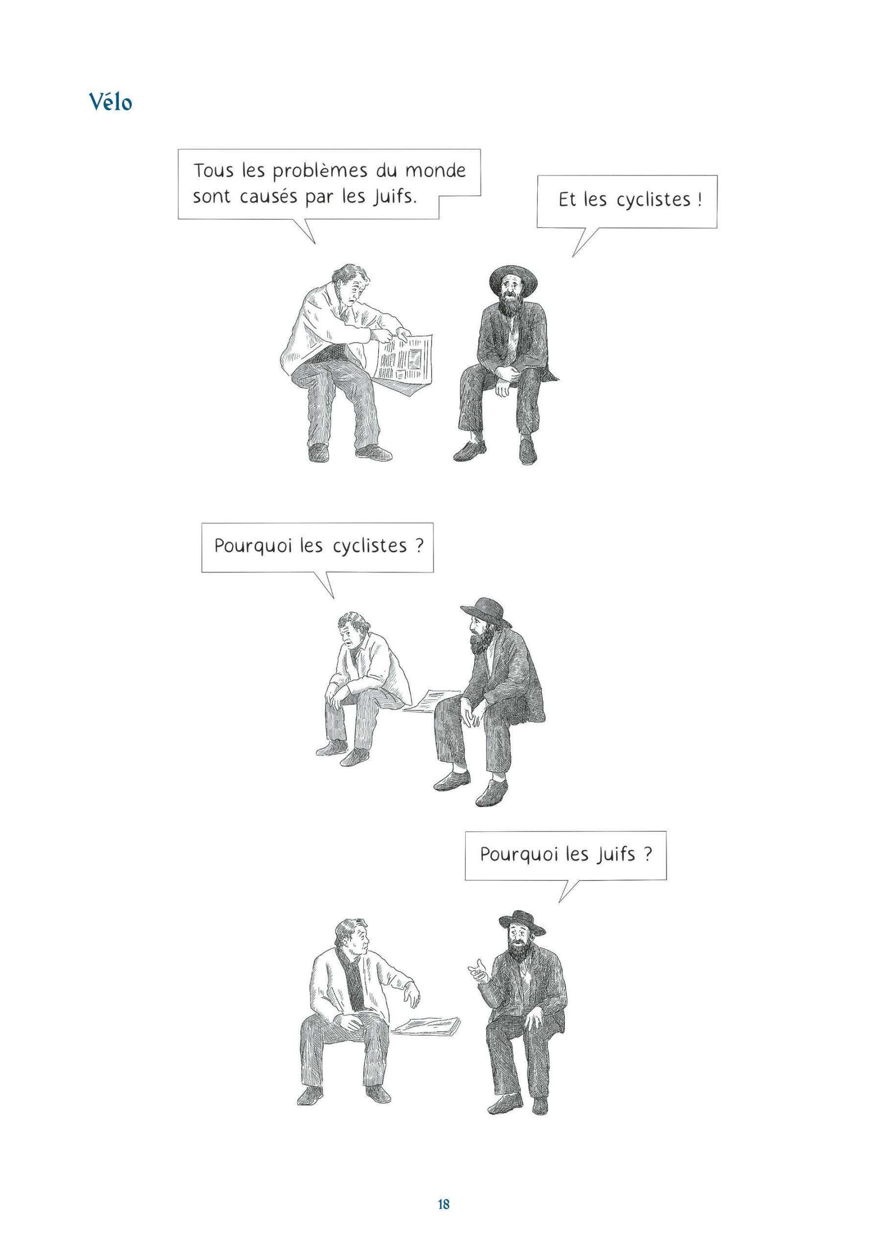 Pas de cases et de cadre pour les saynètes de Constance Lagrange. Un dessin en noir et blanc finalement très libre, qui se lit de haut en bas de la page, avec parfois un empilement. Le dessin de l’autrice de L’innocent incompris : Patrick Dils, histoire d’une erreur judiciaire lorgne du côté de la gravure et du dessin de presse du début du XXe siècle avec ses hachures. Un dessin et un découpage qui fonctionnent à merveille pour ces courtes blagues.