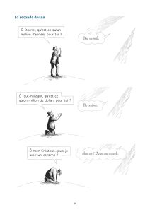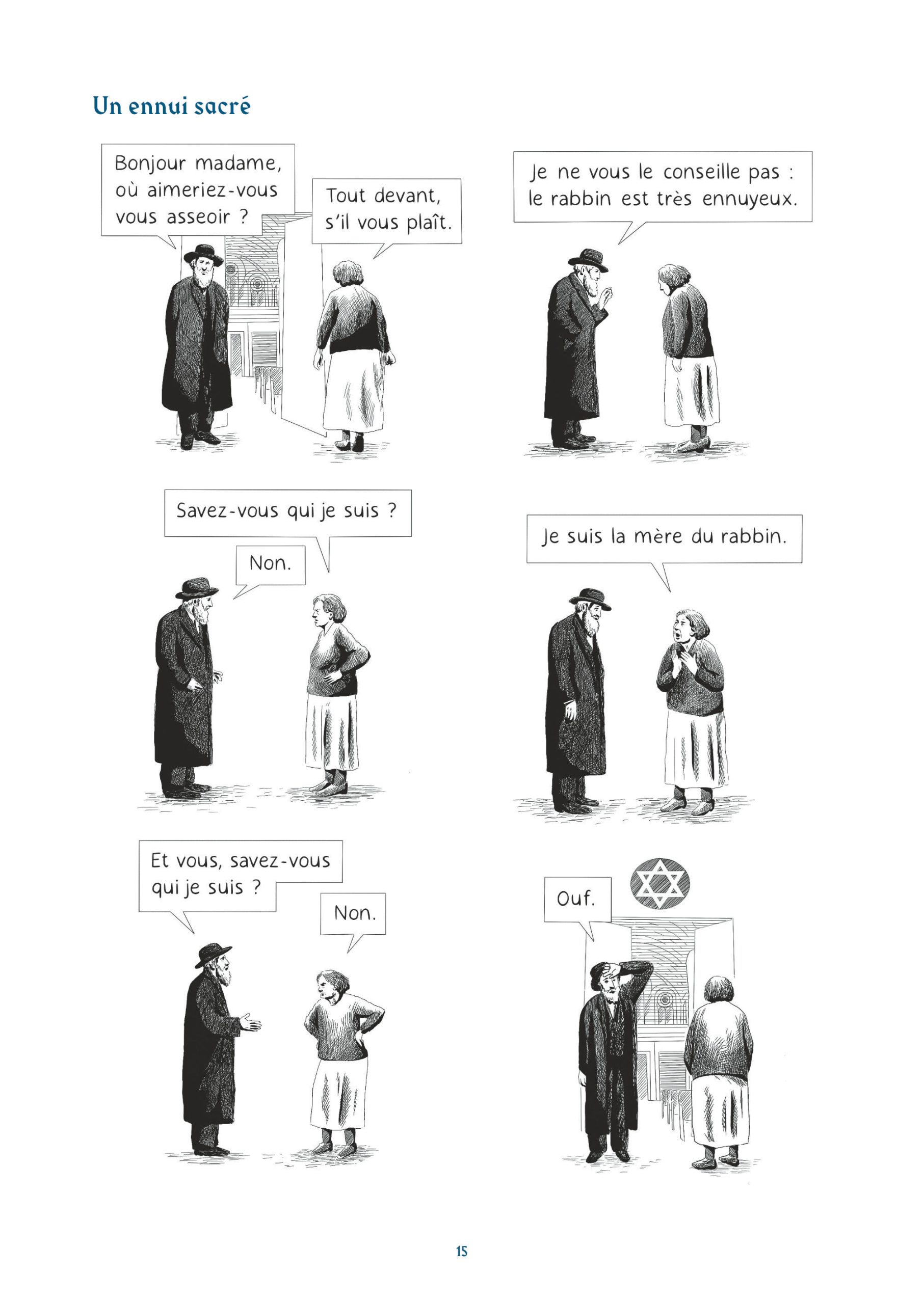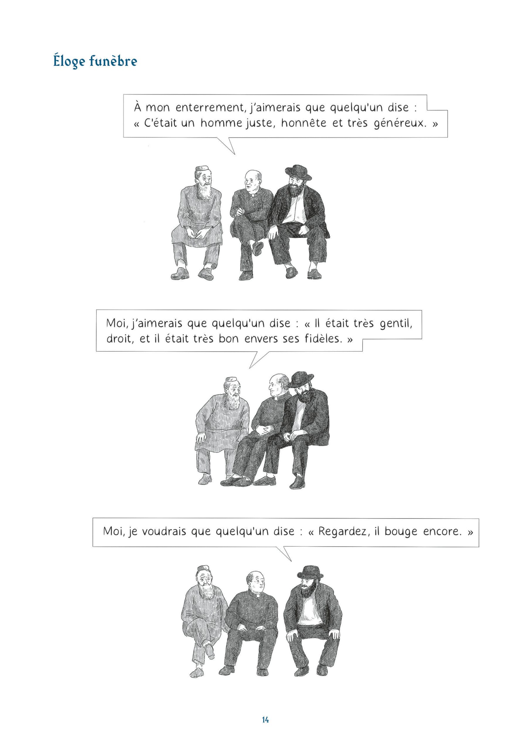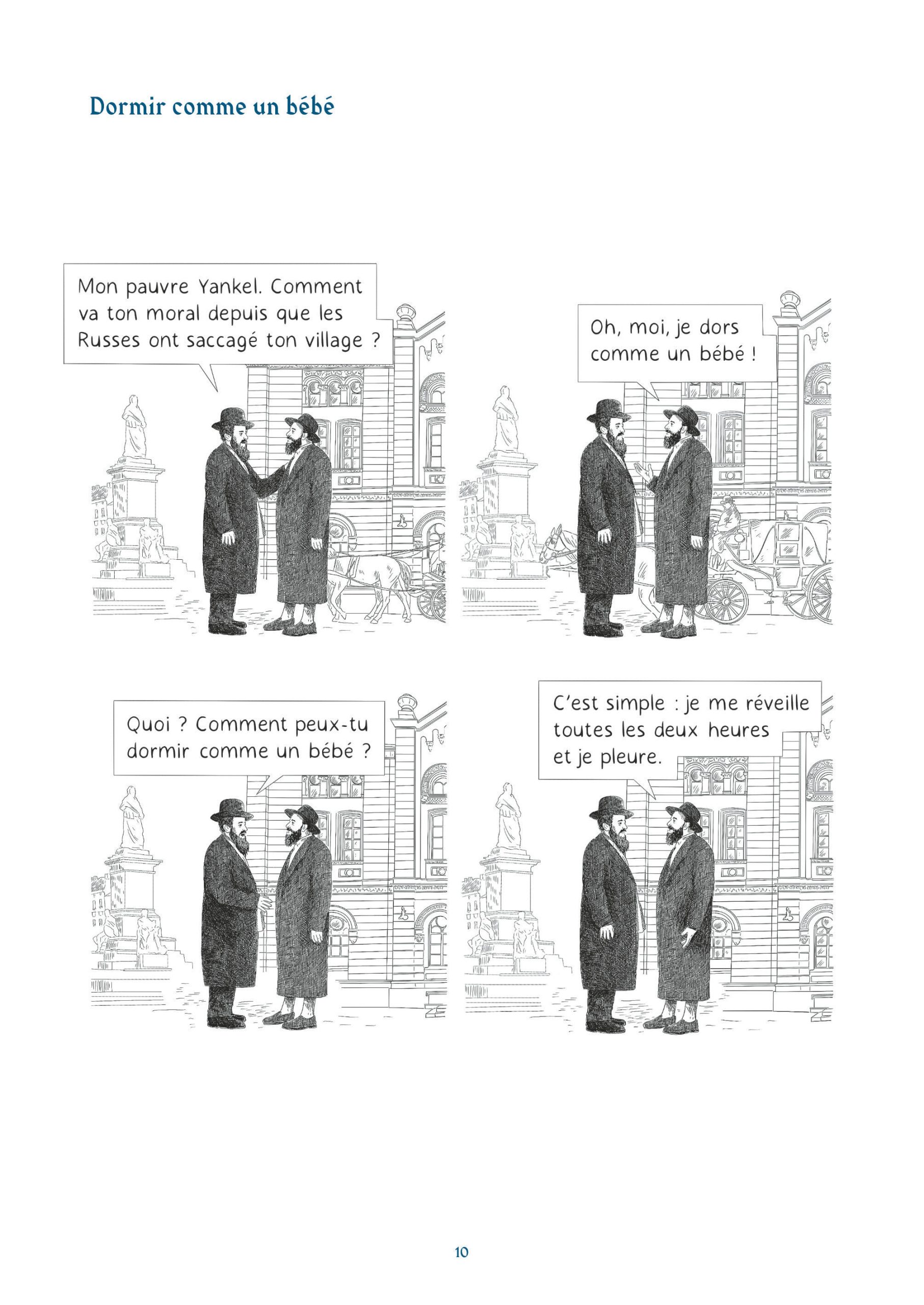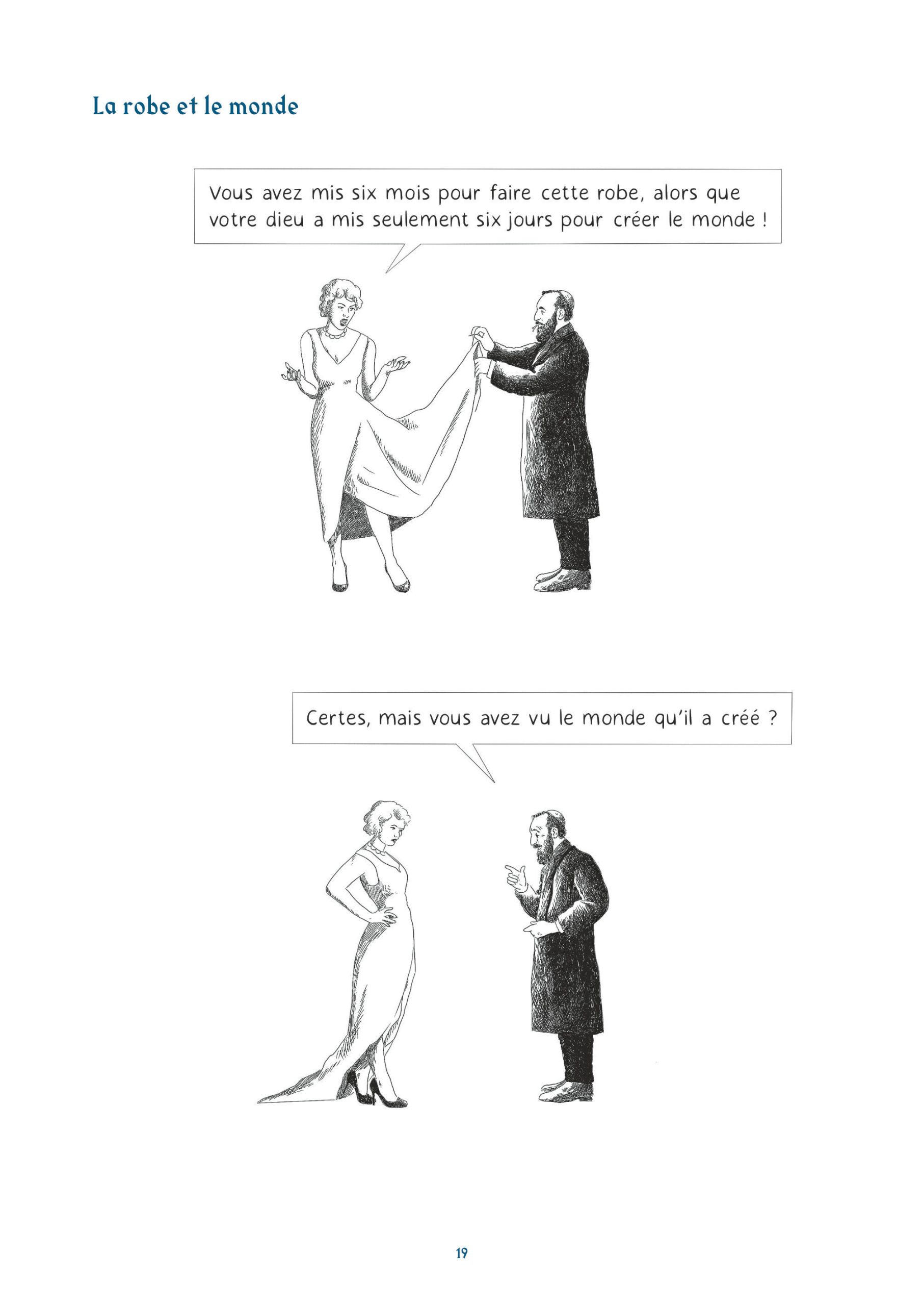 Les lecteurs naviguent ainsi dans des thématiques que l’on accole souvent à l’humour juif. On y retrouve des mères surprotectrices, des pères perdus quand ils parlent de leurs filles ou l’argent. Cet humour très absurde, sur un fil, mais aussi un humour très pragmatique, devant la mort, devant Dieu, devant un choix cornélien. Une réponse logique face à une situation précise.