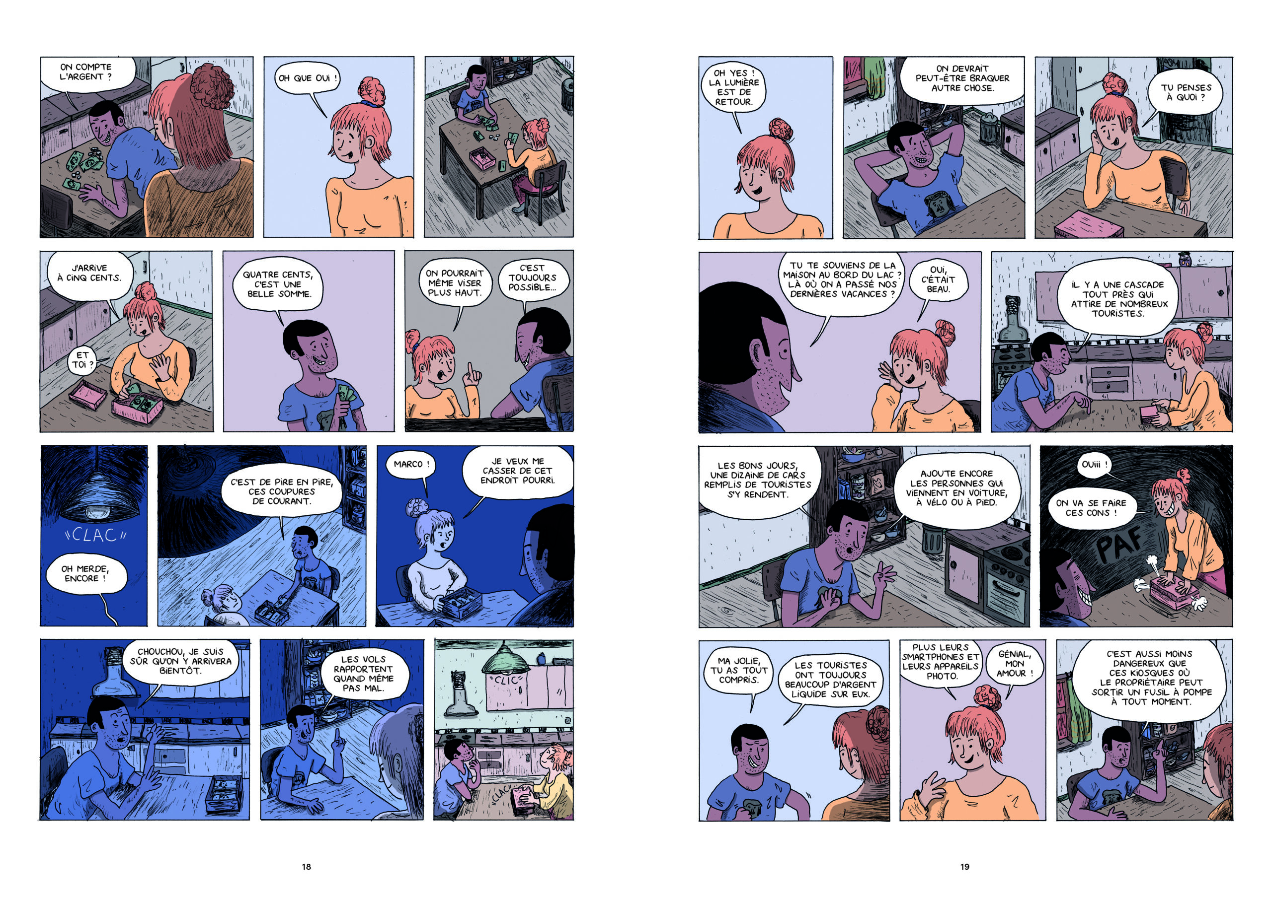 Mais pour autant, il y a de la constance dans le travail de Tobias Aeschbacher et son style un peu sale convient finalement assez bien à la tonalité du récit qu’il propose. La mise en couleur, très grise et terreuse, répond aux mêmes exigences. Certes, on est loin des maîtres du dessin. Mais côté narration, Aeschbacher sait répondre présent. Et ça tome bien, on lit de la Bande Dessinée, pas un recueil d’illustrations.