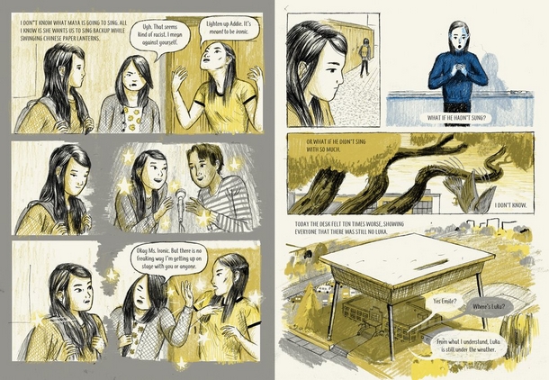 Par Opératique, Kyo Maclear aborde des thèmes contemporains forts : l’amitié, l’amour, la solidarité, le rejet des gens différents – Luka prend soin de lui, a une voix très singulière et disparait souvent du lycée – l’acceptation de soi et des autres.