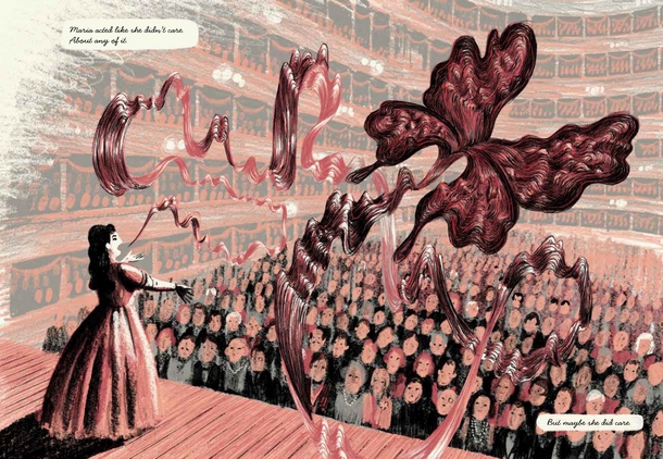 Opératique bénéficie d’une très jolie partie graphique signé Byron Eggenschwiler. Le dessinateur canadien réalise de très belles planches à la palette numérique. Son trait est vif et moderne. Ses couleurs jaune pour la période actuelle et rouge pour la vie de la Callas sont magnifiques.