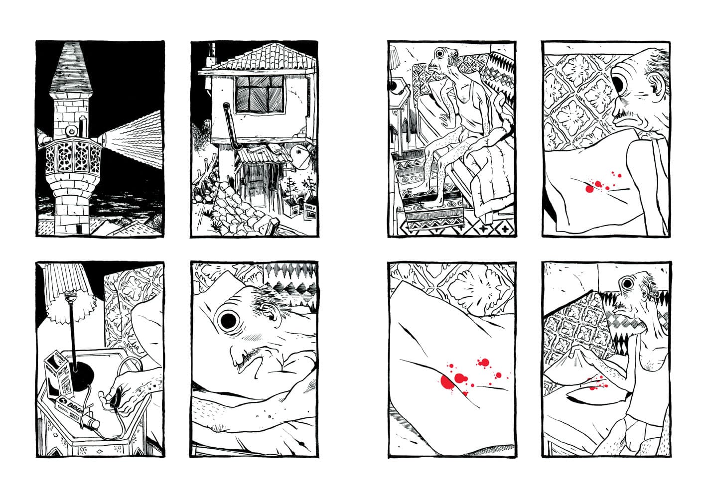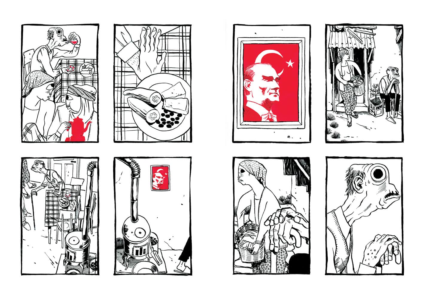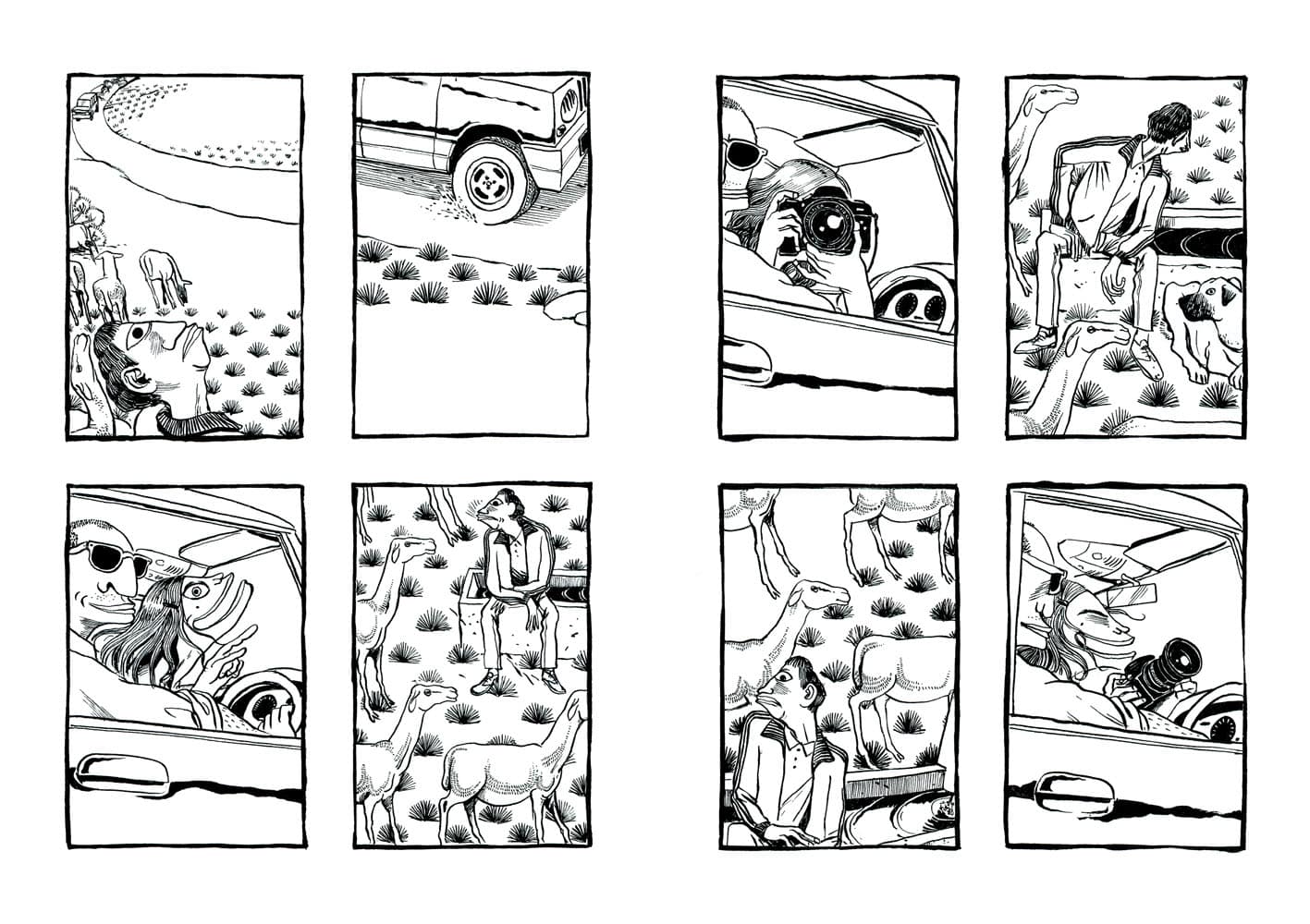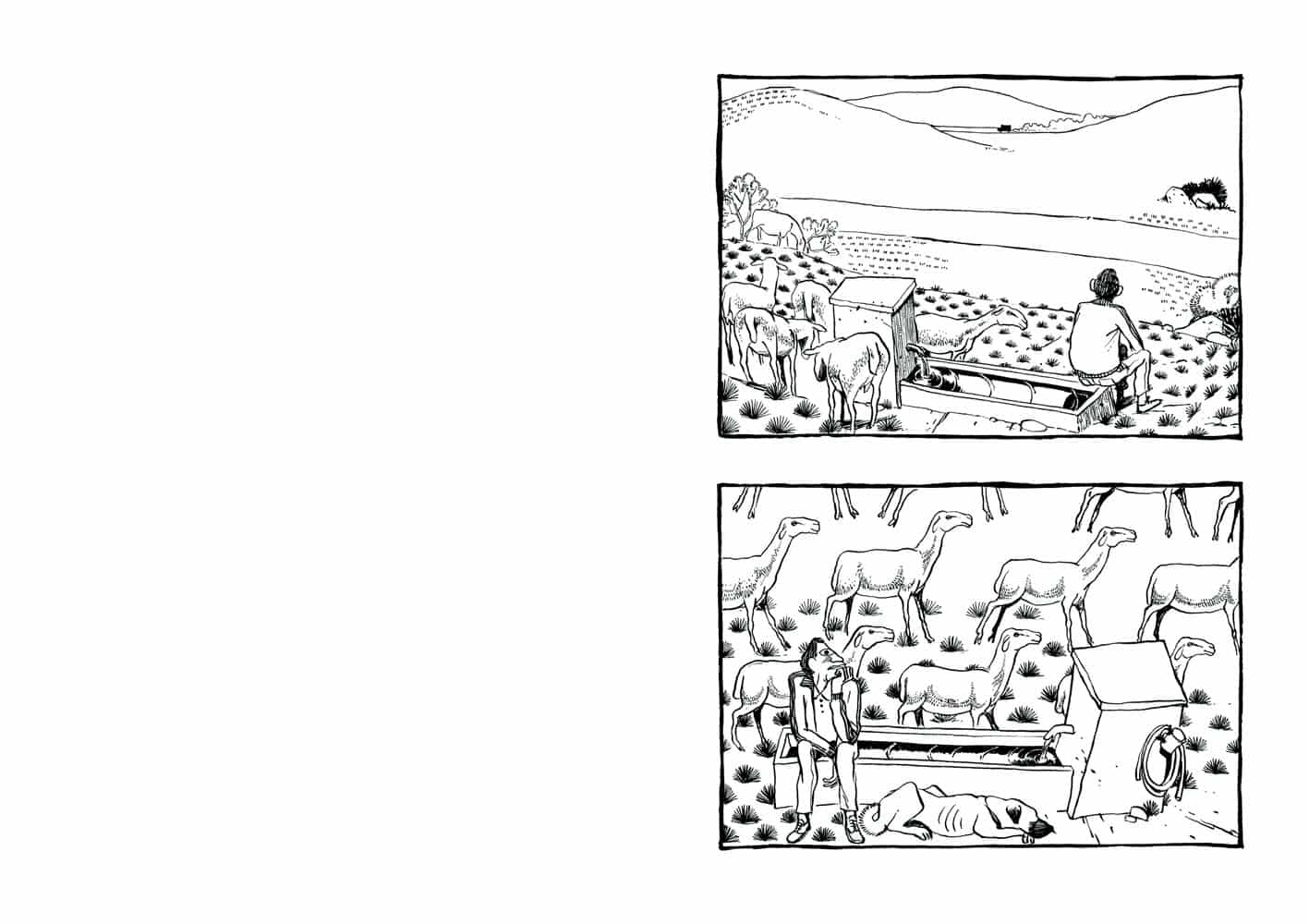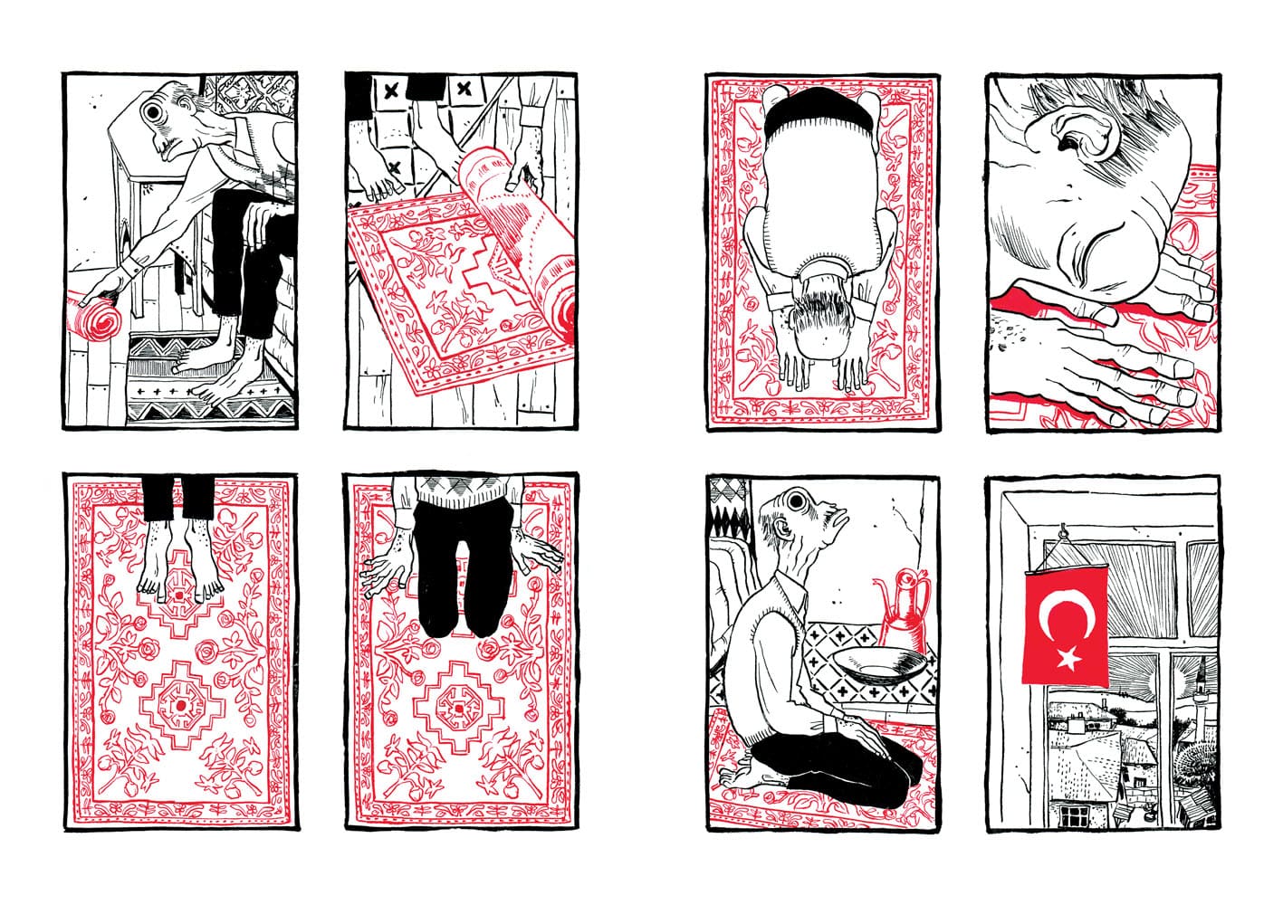 De prime abord, vous n’auriez pas été tenté de lire cet album (pas de dialogues, album muet et un dessin très singulier). Et vous auriez eu tort, passant à côté d’une magnifique histoire. Le récit sensible de Nicolas Presl est tout en pudeur, effleurant les sentiments différents suscités chez ses personnages. Le schéma narratif accentuant les relations entre eux. Dans ce village reculé de Turquie, la tradition est représenté par la figure du vieil homme tandis que la modernité l’est par le jeune berger avide d’émancipation rêvant d’Ankara. De leur côté, le couple de touristes représentent l’accident, toujours à l’affût avec leur appareil photos ; sans gêne, ils se croient tout permis grâce à l’argent. Sortant les pièces pour faire ce dont ils ont envie comme un visiteur de zoo jetterait des cacahuètes aux singes. Ils ont payé leur voyage, ils « doivent » voir du pays. Les planches en noir et blanc sont soulignées par des couleurs porteuses de sens : rouge pour l’objet important (chaussures, les photographies) et le bleu pour adoucir (la mort du vieil homme, les décorations de la mosquée…).
