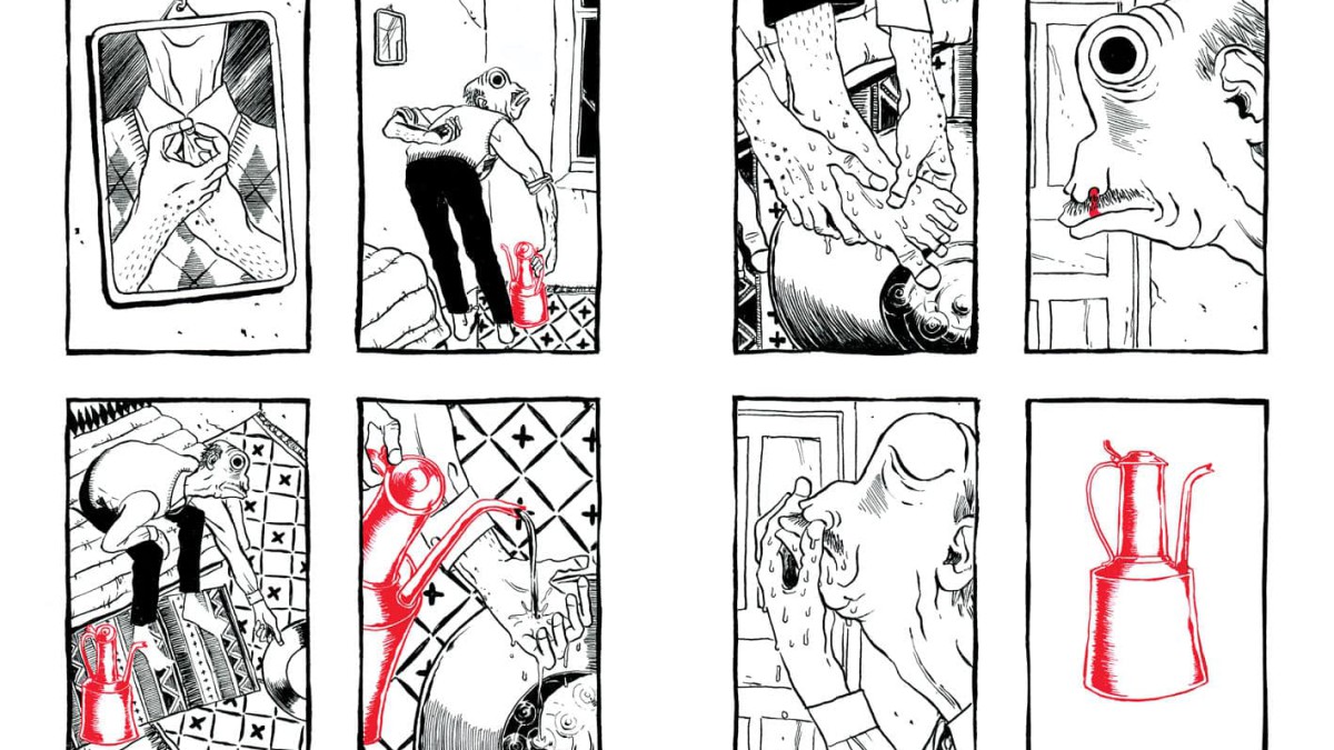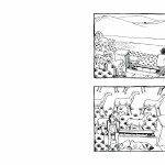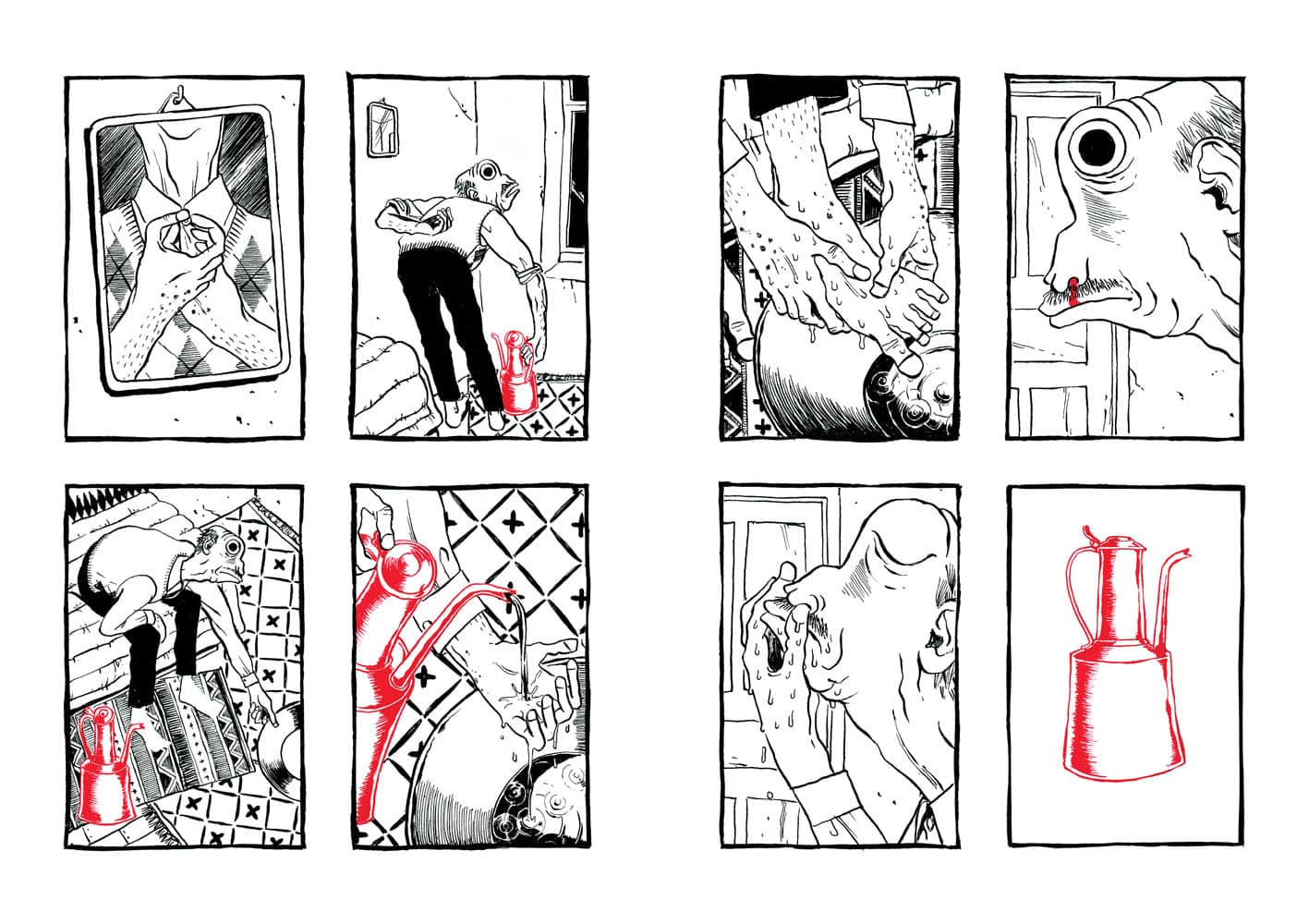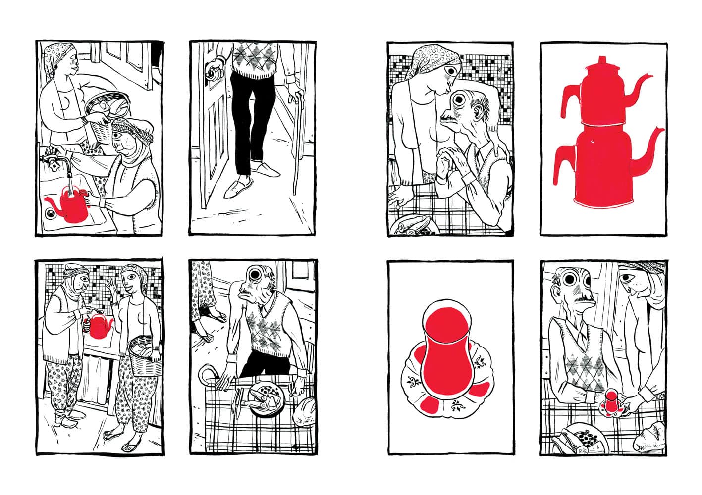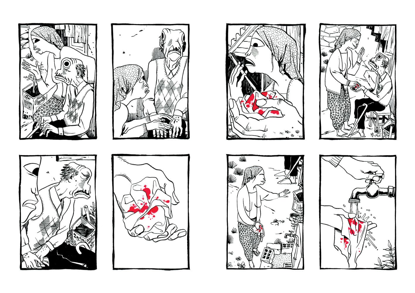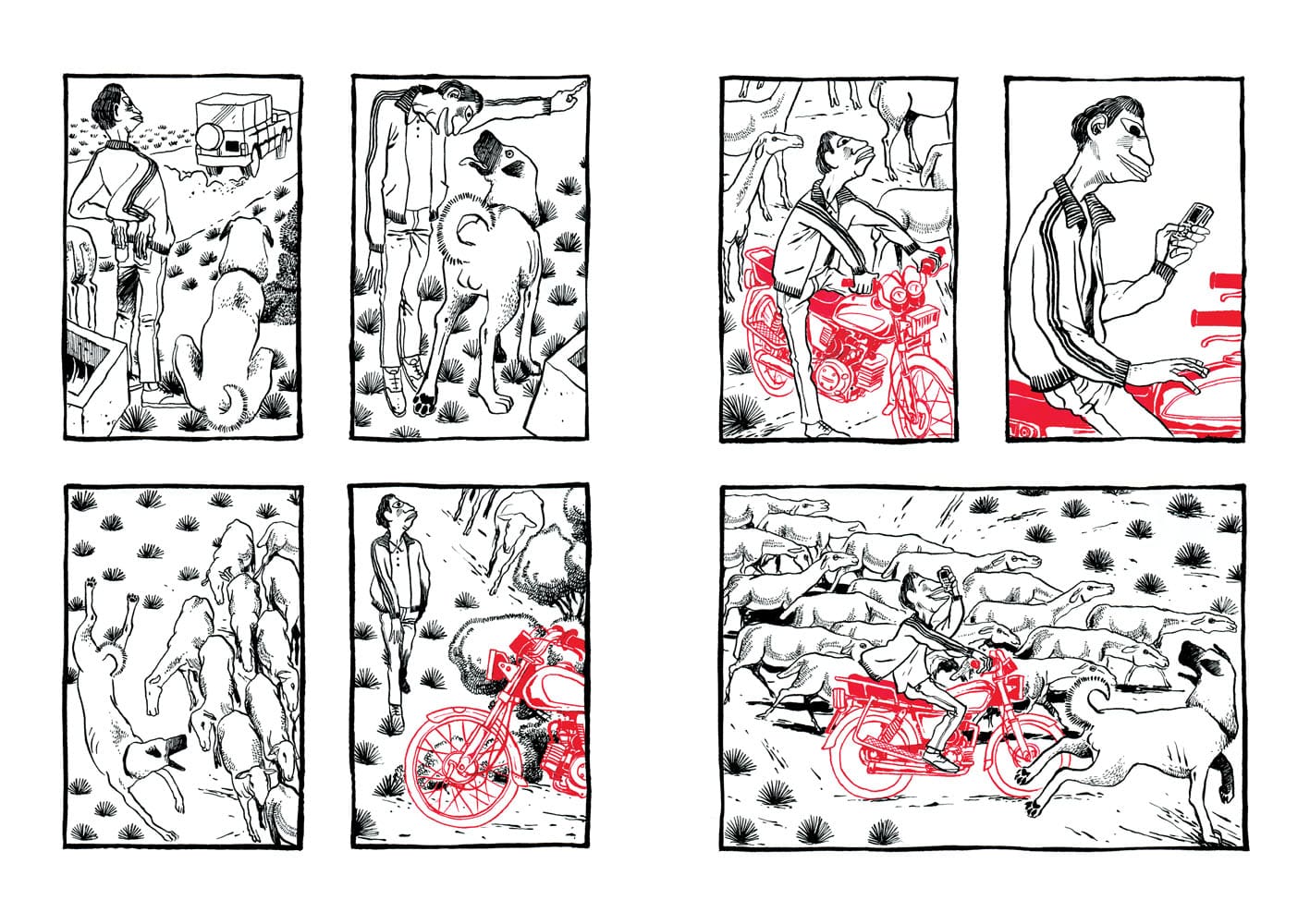 De prime abord, vous n’auriez pas été tenté de lire cet album (pas de dialogues, album muet et un dessin très singulier). Et vous auriez eu tort, passant à côté d’une magnifique histoire. Le récit sensible de Nicolas Presl est tout en pudeur, effleurant les sentiments différents suscités chez ses personnages. Le schéma narratif accentuant les relations entre eux. Dans ce village reculé de Turquie, la tradition est représenté par la figure du vieil homme tandis que la modernité l’est par le jeune berger avide d’émancipation rêvant d’Ankara. De leur côté, le couple de touristes représentent l’accident, toujours à l’affût avec leur appareil photos ; sans gêne, ils se croient tout permis grâce à l’argent. Sortant les pièces pour faire ce dont ils ont envie comme un visiteur de zoo jetterait des cacahuètes aux singes. Ils ont payé leur voyage, ils « doivent » voir du pays. Les planches en noir et blanc sont soulignées par des couleurs porteuses de sens : rouge pour l’objet important (chaussures, les photographies) et le bleu pour adoucir (la mort du vieil homme, les décorations de la mosquée…).
