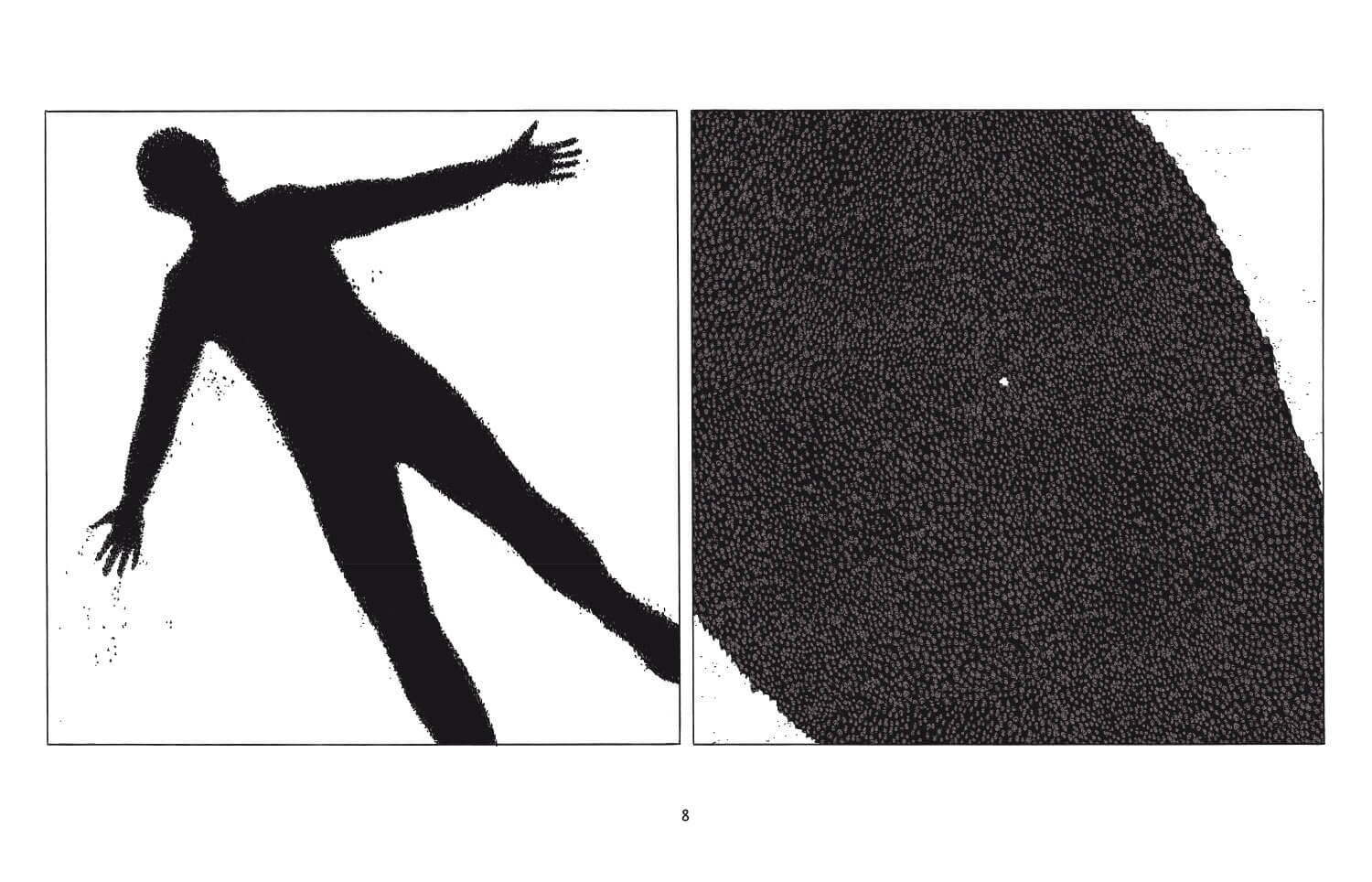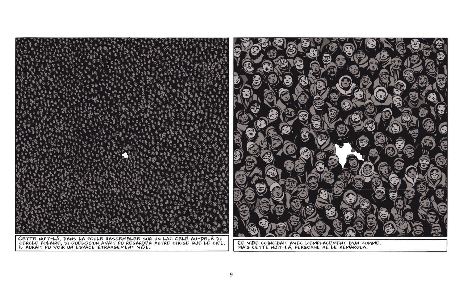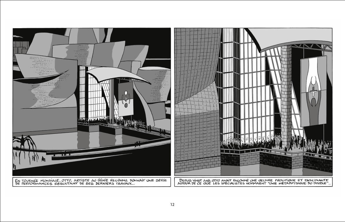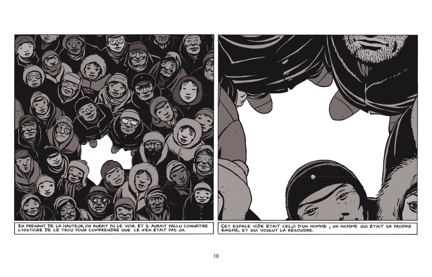 Son trait en noir et blanc, agrémenté de teintes de gris, fascine et envoûte. D’une grande sobriété mais redoutablement efficace, son dessin rythme un découpage identique pour chaque page (deux cases carrées). Comme pour ses précédentes publications, il joue avec les formes géométriques, qui parfois se démultiplient.