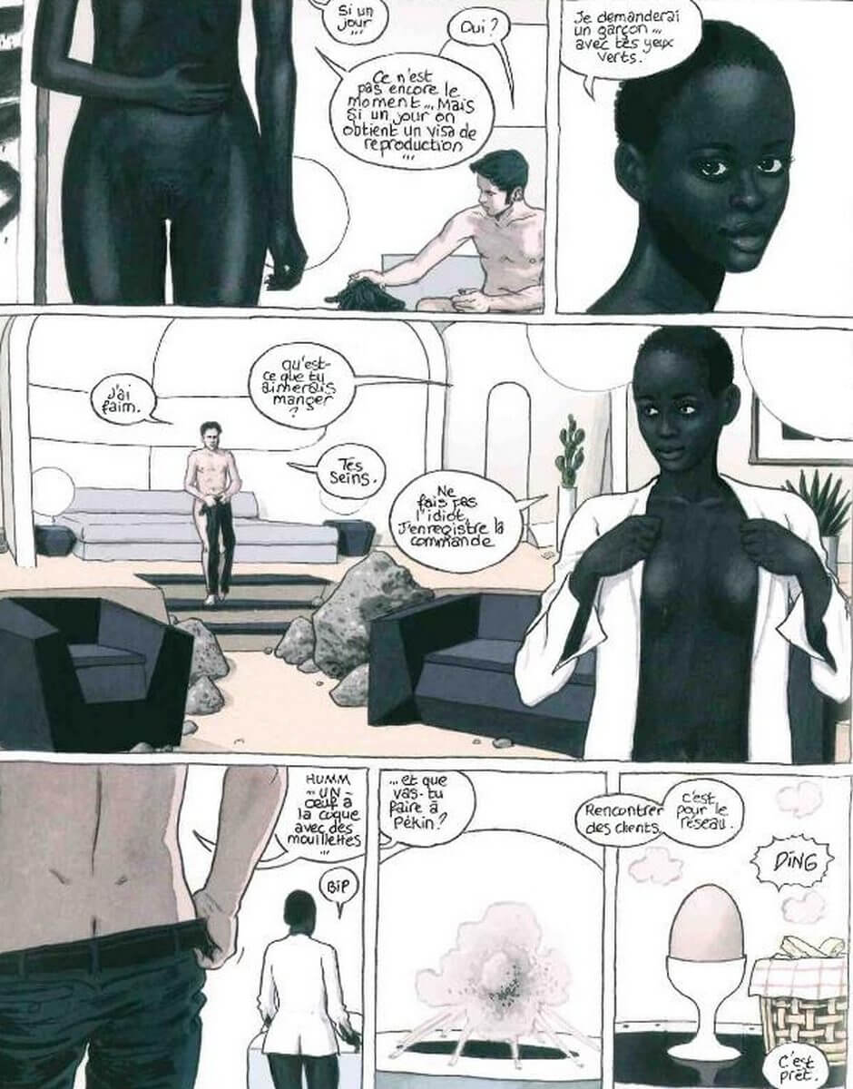Cette ambiance anxiogène et sombre vient trouver répit lorsqu’il retrouve Kloé à son appartement. La belle femme dégage beaucoup d’assurance et s’obstine à convaincre Tristan d’utiliser le Transcore. Elle-même adepte de la cabine à téléportation, Tristan n’en reste pas moins méfiant. À l’heure où la procréation laisse place à un visa de reproduction, le jeune homme n’est pas prêt. Au moment où les œufs à la coque se préparent grâce à un programme dédié, il est sceptique.