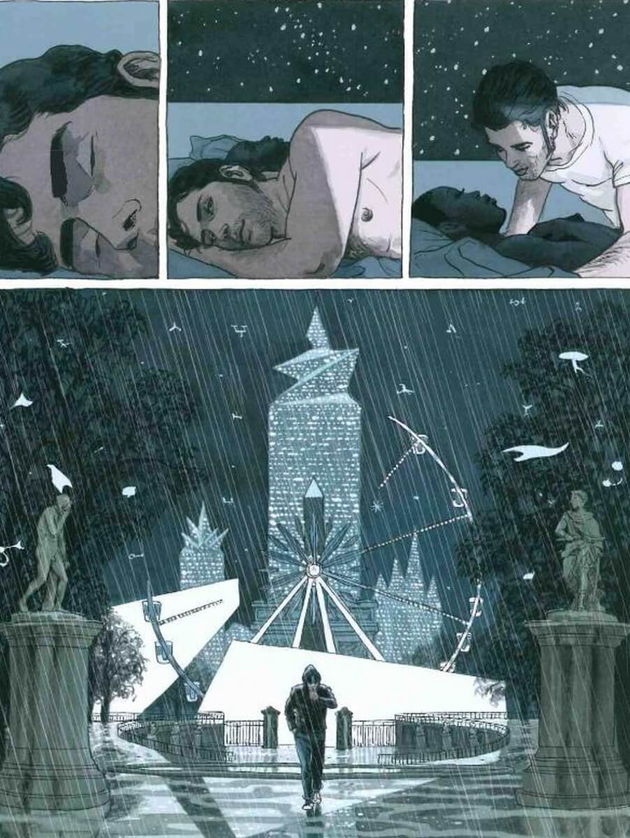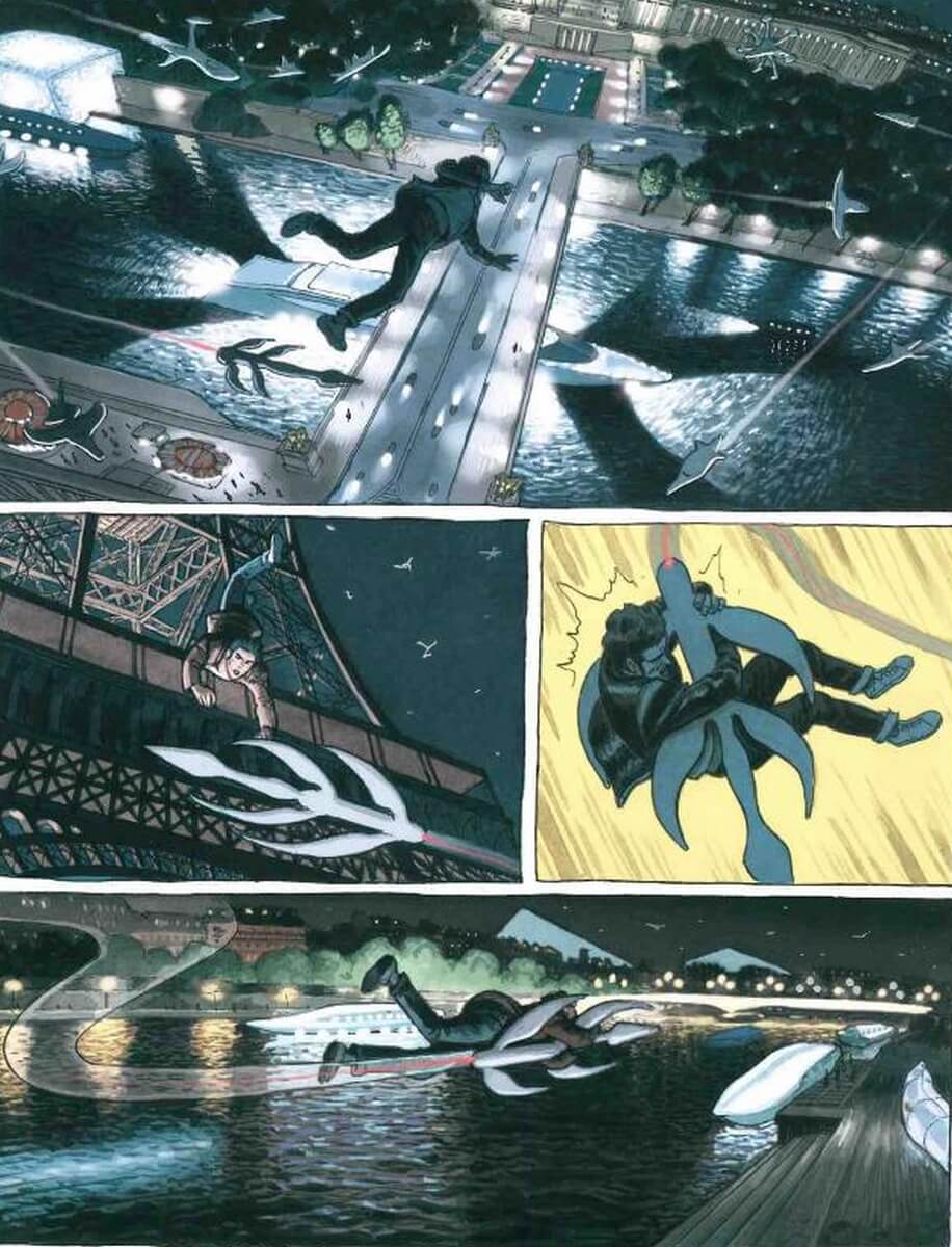 Quant à la partie graphique de Dominique Bertail, elle est bluffante d’efficacité. Non sans rappeler l’univers de Bilal, le dessinateur est déroutant dans son approche de la capitale du XXIIe siècle. Car nous ne sommes pas dans un cadre méconnaissable de la Ville-Lumière. Les monuments célèbres sont là, certains sont accaparés, mais leurs édifices n’ont pas vieilli. Les avenues, les rues, les bâtiments se voient ajouter quelques éléments futuristes. Les drones et milices sont présents en nombre. Mais tout ceci est parsemé avec modération. Ainsi, Paris 2119 devient autant crédible en images que dans son contenu scénaristique.
