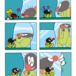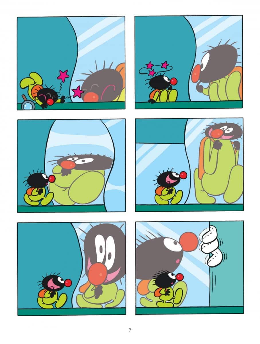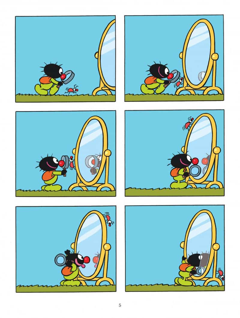 L’humour subtil visible au début de l’album (la belle osmose entre le marionnettiste et le héros) se transforme en légère humiliation lorsque l’homme le singe, se moque de lui : Petit Poilu est ridiculisé. Furieux, il ira jusqu’à se battre. Voilà la grande force de la série : aborder des thèmes forts de la vie et les confronter aux émotions que pourraient ressentir les enfants dans de telles situations. L’introspection et la quête d’identité sont donc traitées avec humour et subtilité.