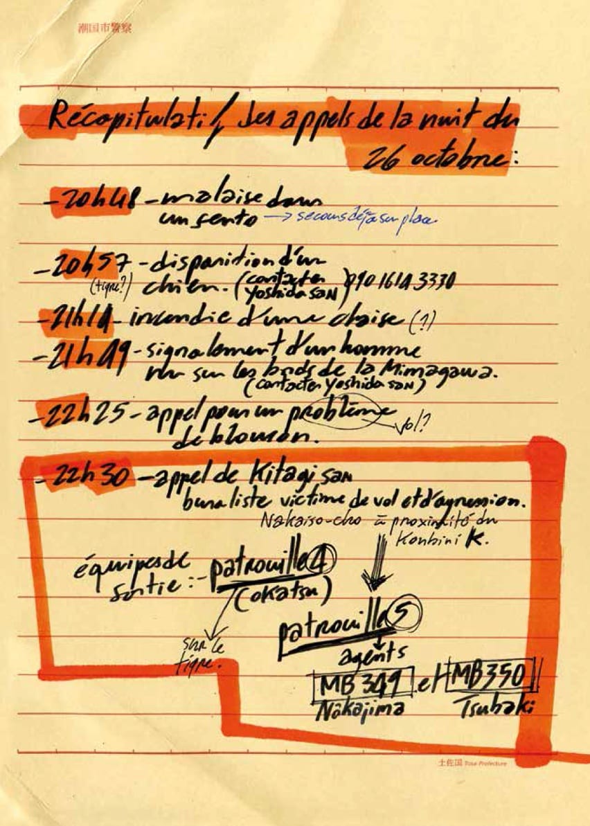 Dans un dédale de rues parfois mal éclairées, nos personnages se débattent dans une histoire compliquée à souhait. Les scènes d’actions et de bagarres qui font penser au polar façon Tarantino sont ponctuées par des planches reproduisant des relévés cartographiques, des rapports de police, des tickets de caisse, des billets, des coupures de presse. Page après page, si l’on est séduit par une débauche de couleurs et des cadrages façon manga, on se perd un peu dans le déroulé des événements. Les événements qui constituent la trame de cette histoire sont en effet rapportés par plusieurs voix, et dans le désordre.