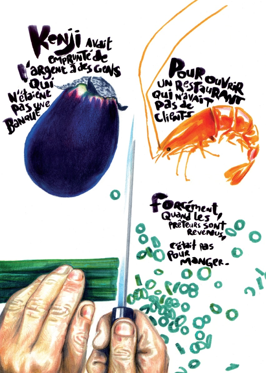 » Kenji avait emprunté de l’argent à des gens qui n’étaient pas une banque pour ouvrir un restaurant qui n’avait pas de clients. Forcément, quand les prêteurs sont revenus, c’était pas pour goûter les plats ».