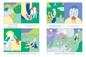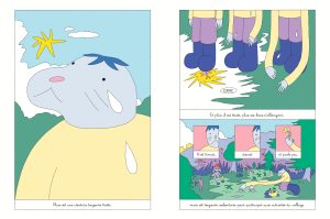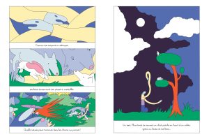 Pour sa partie graphique, l’autrice utilise l’outil numérique. Les planches sont construites tantôt de gaufriers en 4 vignettes, tantôt d’illustrations pleine page. Son dessin est très lisible et très moderne. Les couleurs sont composées de grands aplats à dominantes de bleu, vert, jaune, violet et rouge.