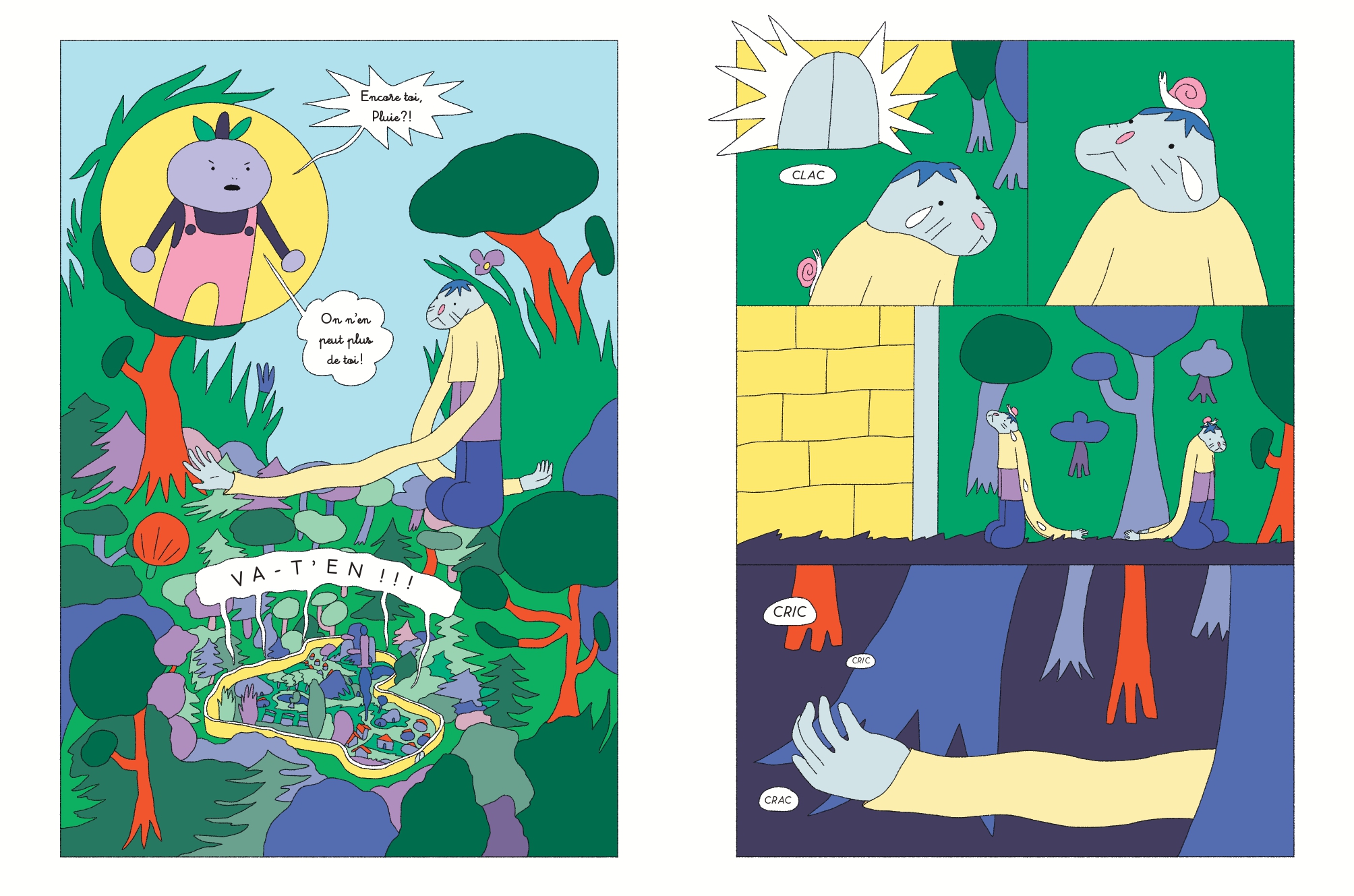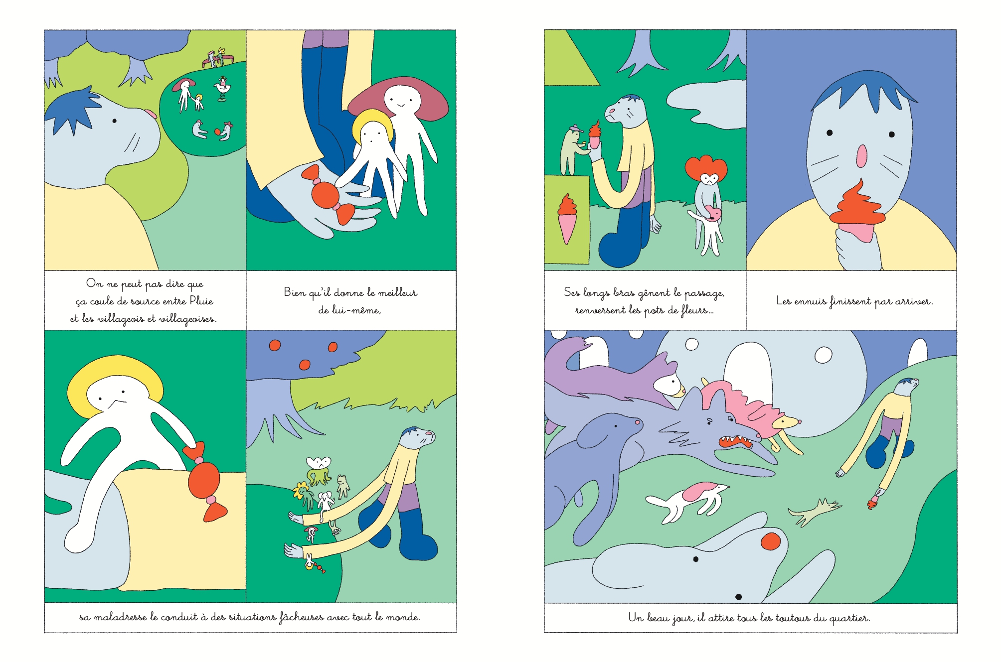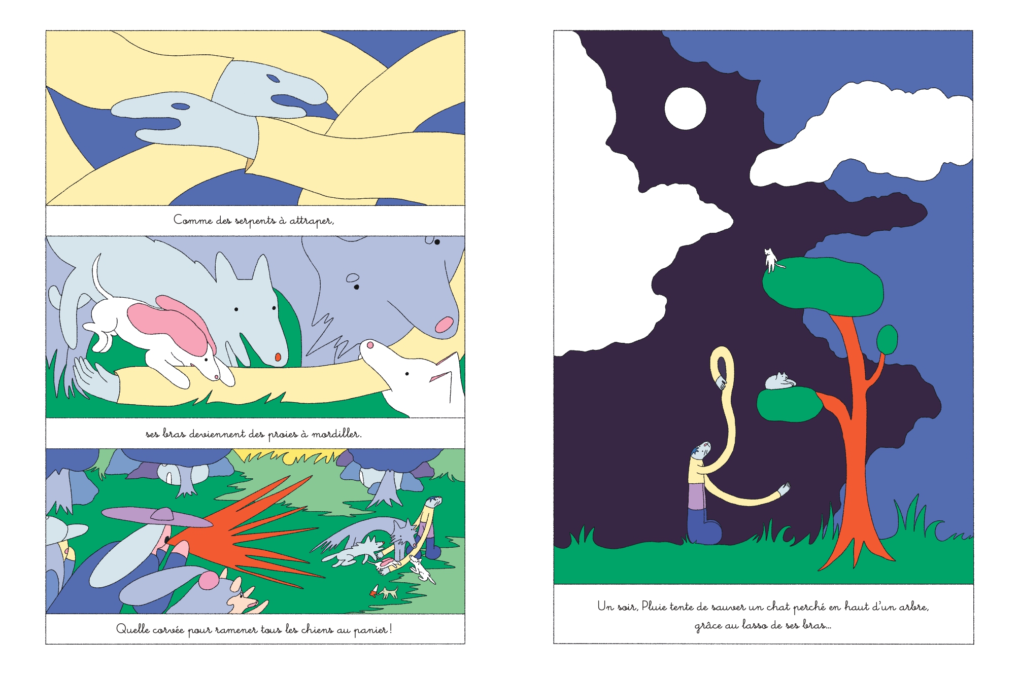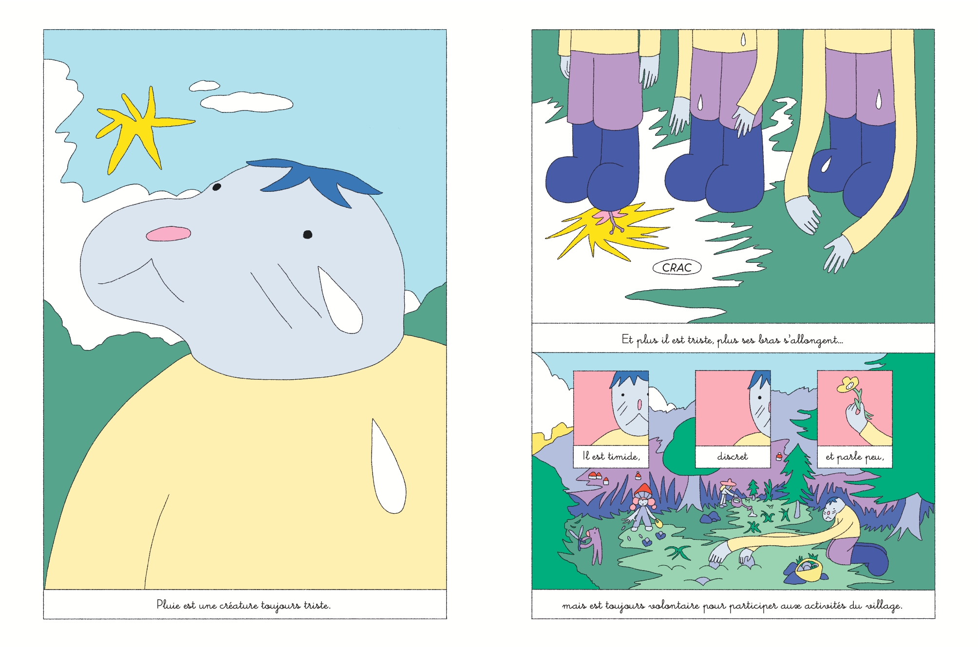 Pluie est toujours triste. Plus la créature est triste, plus ses bras s’allongent. Malgré ce handicap, il tente de venir en aide aux habitants de son village. Mais rapidement, ils n’en peuvent plus de cette maladresse dûe à ses bras. Pauline Morel met en image ce très joli récit édité par Panthera.