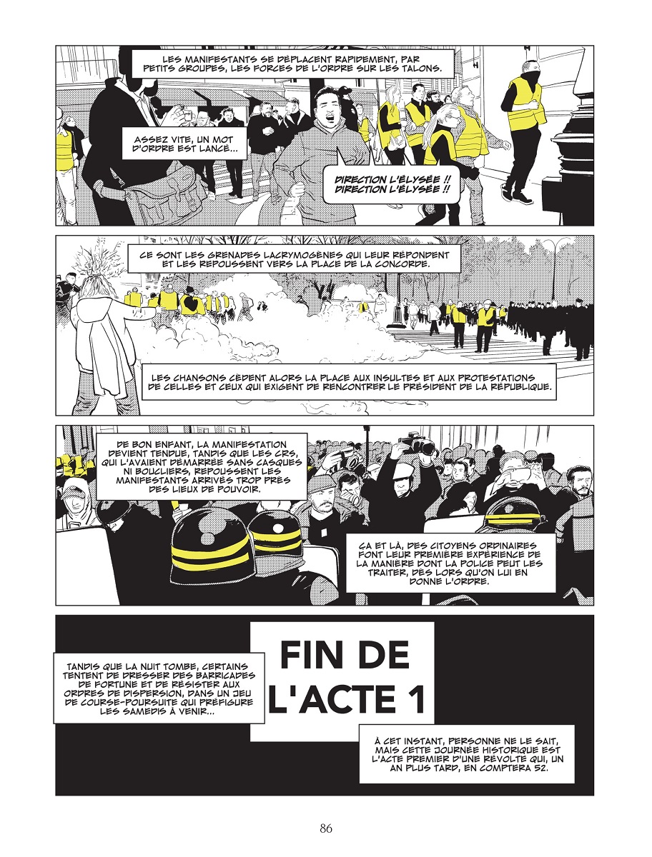 Le dessinateur des séries Quaterback, La rage et La banque propose de très beaux aplats de noir et de jaune. Cette couleur notamment pour faire ressortir des éléments forts des planches comme les gilets des manifestants.