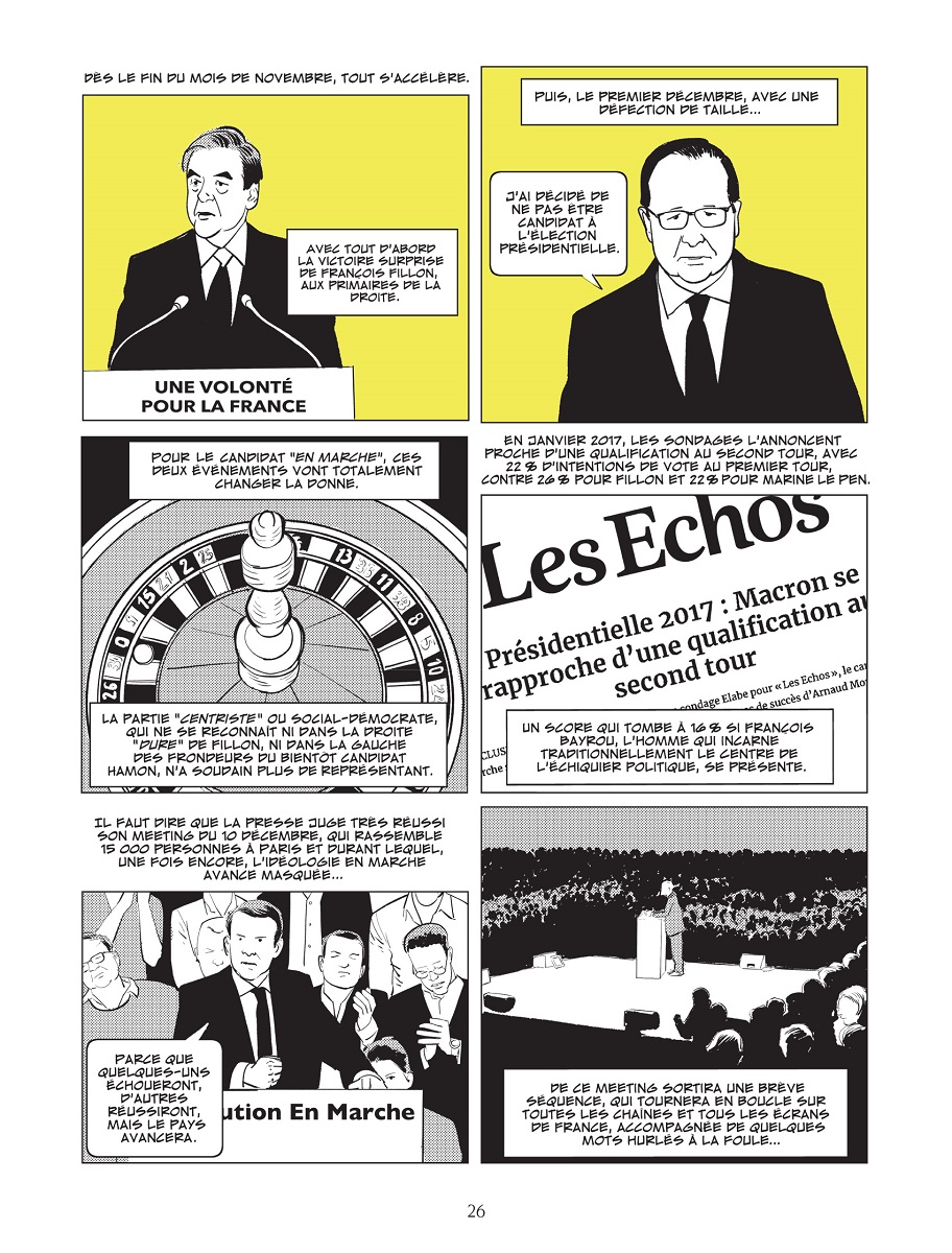 Alors David Chauvel creuse et cherche dans le passé d’Emmanuel Macron pour comprendre vraiment qui il est. Plus jeune président de la Ve république, il prend tout le monde de vitesse à la fin de l’année 2016 en créant son parti En Marche. Il fallait déjà y voir un côté mégalo lorsqu’on utilise ses initiales (EM) pour dénommer son parti. François Hollande écarté par lui-même – il ne se représente pas – une campagne éclair, une qualification au deuxième tour avec « seulement » 18,19% des suffrages exprimés (soit 8 656 000 voix) et un « front républicain » face à Marine Le Pen et voici le premier mandat dans la poche.