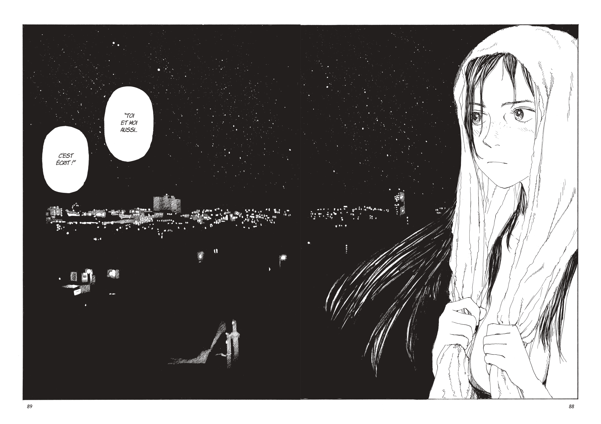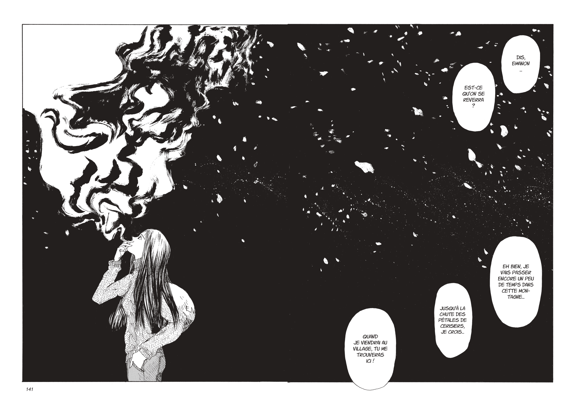 Kenji Tsuruta s’est emparé du scénario de Shinji Kajio avec une plume délicate. Ses traits sont doux, fins. Ils s’harmonisent parfaitement avec les immenses aplats noirs qu’il utilise parfois. Ses planches pleines de contraste correspondent bien à l’histoire d’Emanon. On y voit une petite créature, précieuse d’exister, dans l’infini vaste et déroutant.