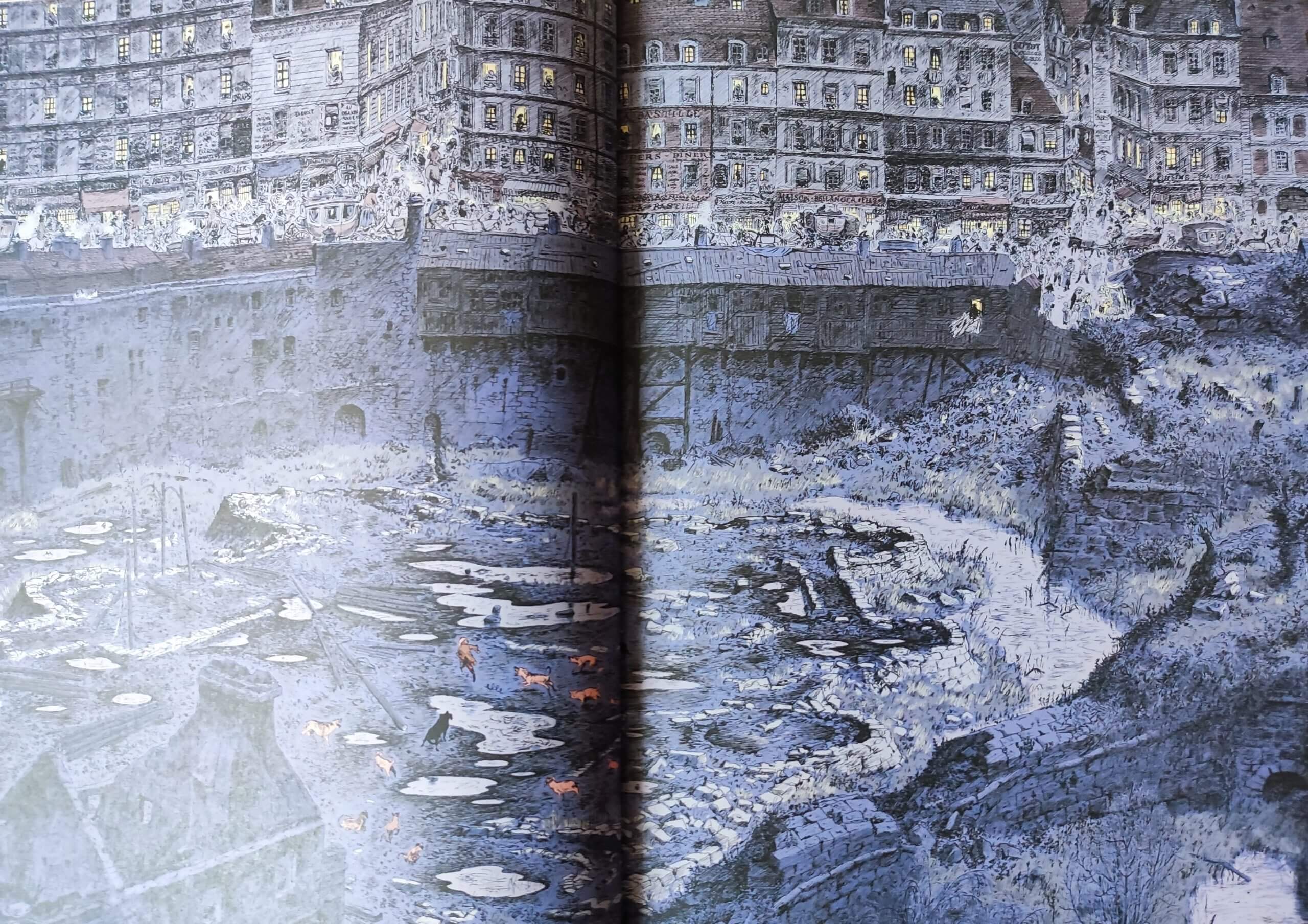 Au-delà des magnifiques couleurs s’appuyant sur des nuances de bleus, d’ocres et de rouges, les planches sont époustouflantes. Il suffit de se pencher sur les doubles-pages où les monuments sont en majesté pour goûter tout le sel du trait. On notera aussi les similitudes de Laigret avec un certain homme d’extrême-droite ayant affolé la dernière campagne de la présidentielle 2022 avec ses saillies racistes, misogynes et homophobes. Frêle et couard, c’est peut-être une vue d’esprit de ma part.