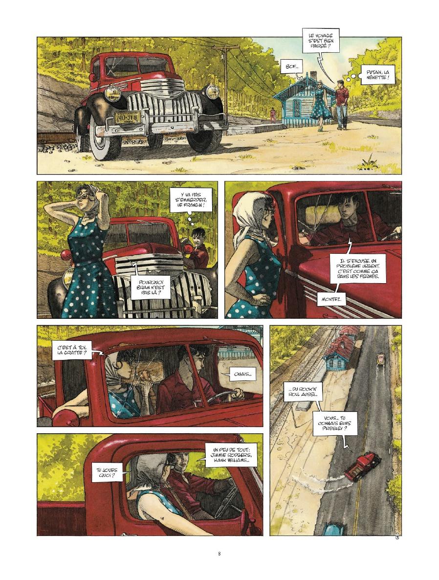 Résumé de l’éditeur. Barbie arrive à Hazard, un coin complètement paumé des États-Unis, après s’être mariée avec Bram. Dans cette nouvelle vie à laquelle elle doit s’adapter, perdue dans cette nouvelle famille un peu détraquée, il y a une lueur d’espoir : c’est le rock’n’roll, passion qu’elle partage avec Hank, son beau-frère. La pin-up, le rock et peut-être l’amour… Dans Rockabilly, c’est la complexité des personnages et le contexte historique qui donne tout son sens au récit : vers 1955, le blues, la country et le rock’n’roll font leur apparition et viennent illuminer la vie d’une génération de jeunes gens qui souffrent au quotidien. Dans les Appalaches, sur la côte Est des États-Unis, les red necks, c’est à dire les Blancs issus de la classe pauvre qui travaillent la terre sous le soleil, vivent dans la misère et ne jurent que par la Bible, la winchester et le bourbon ! Dans une époque où l’adolescence n’existe pas, les jeunes trouvent alors leur épanouissement dans la musique… Rockabilly illustre les déviances malsaines de cette famille prisonnière de sa condition. Un seul exutoire pour nos personnages Barbie et Hank, le rock’n’roll !