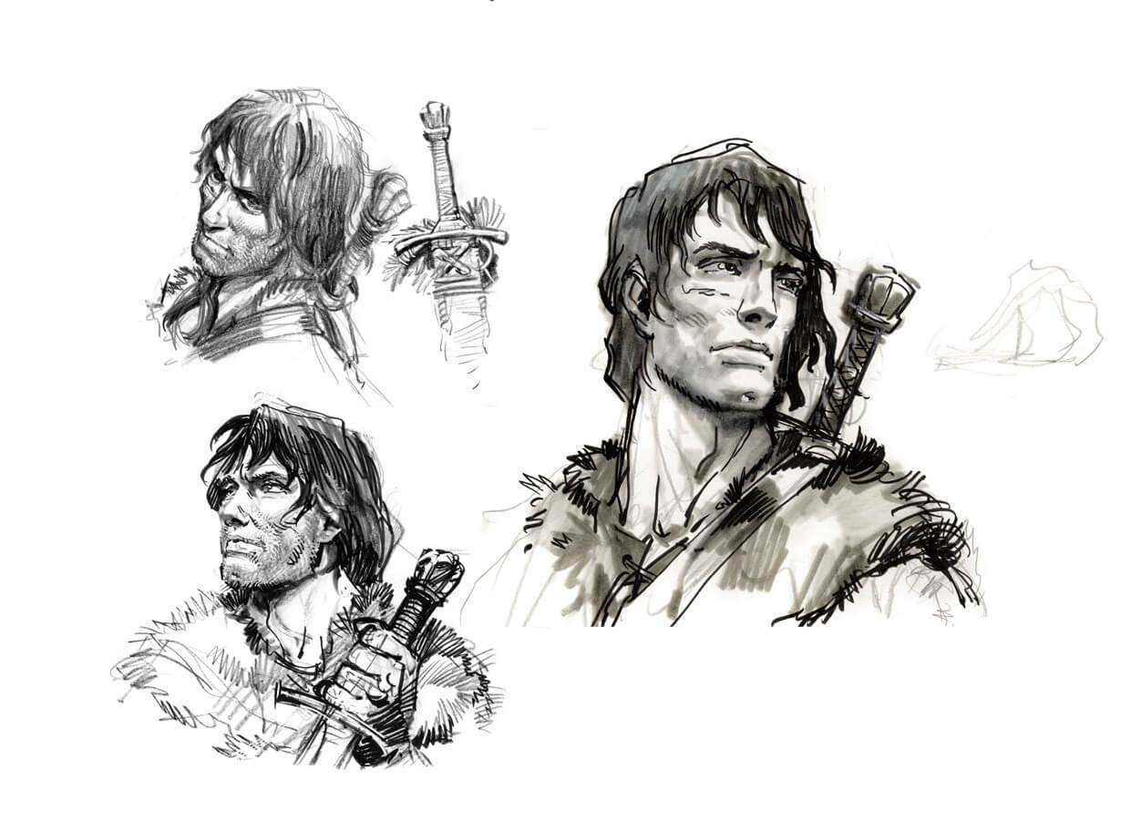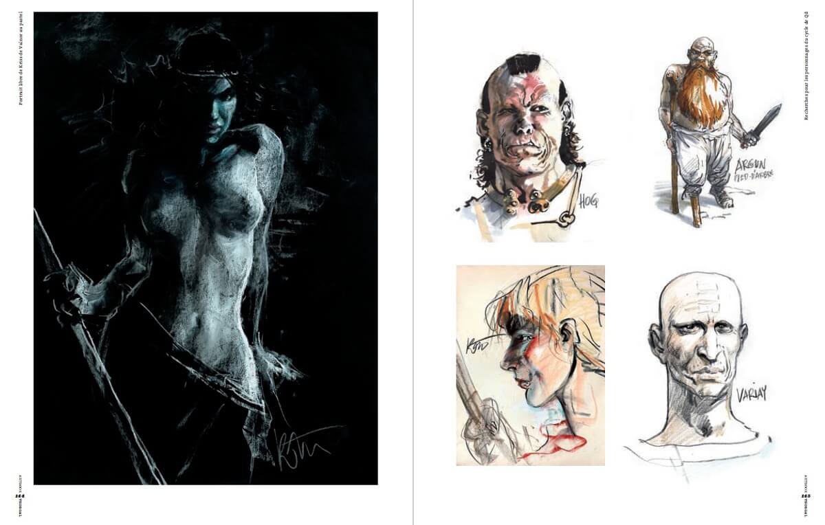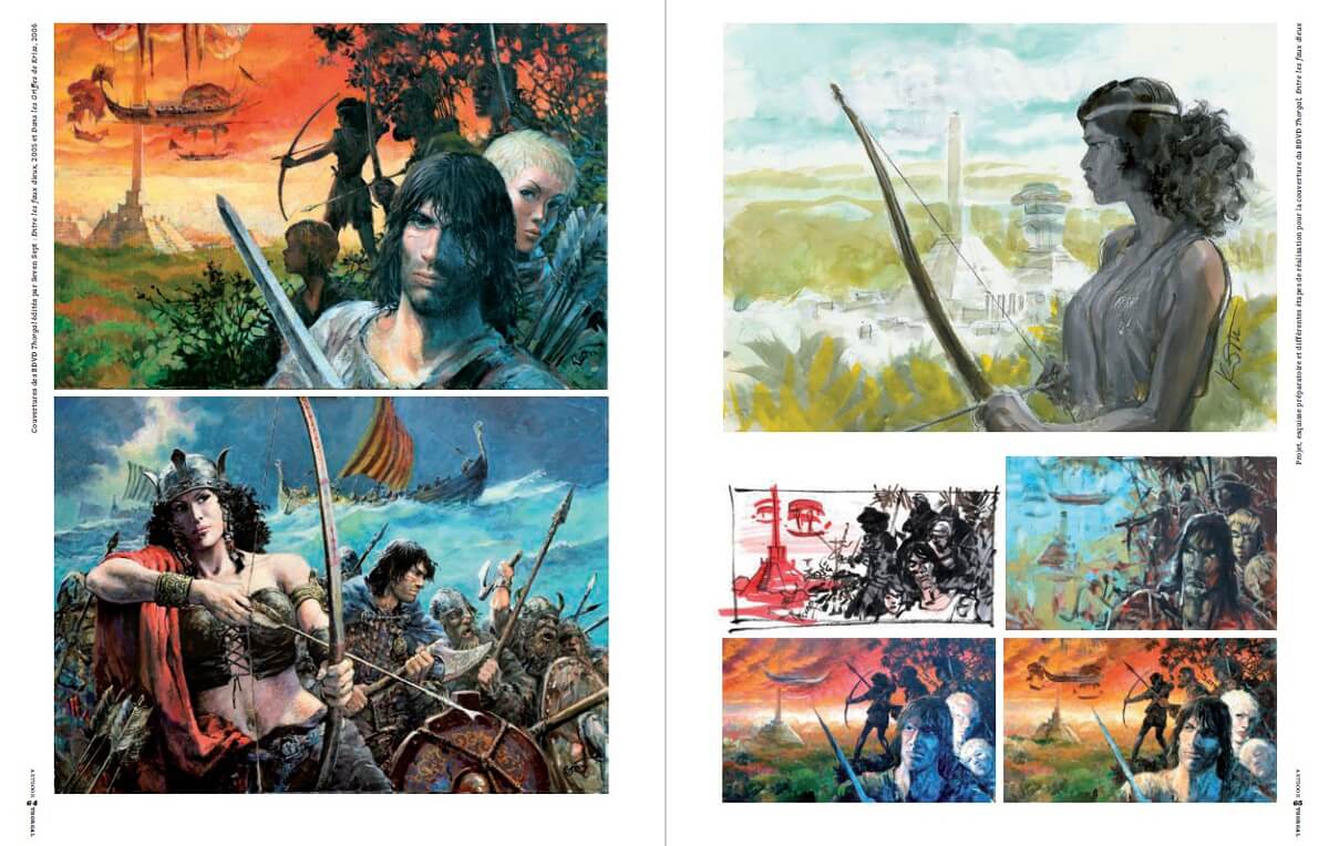 Dans la deuxième partie de l’artbook, une centaine de pages est consacrée aux recherches, esquisses et croquis de Rosinski : personnages, bateaux vikings, couvertures, animaux fantastiques, cavaliers, décors, soldats, armes ou chars.