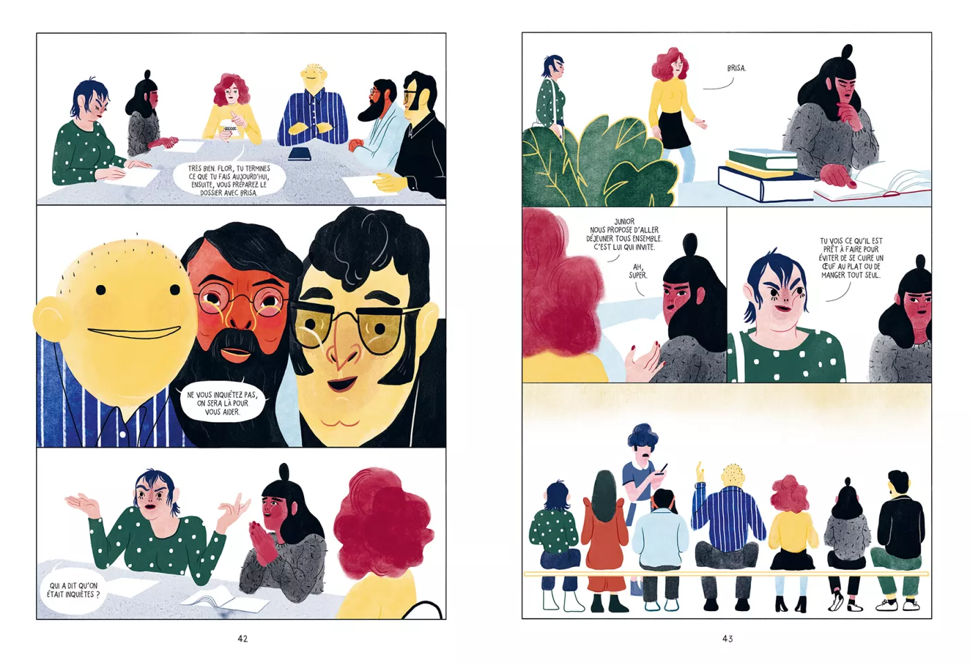 Résumé de l’album : Après des mois de recherches infructueuses, Brisa trouve un emploi dans une agence branchée, spécialisée dans la conception de ronds-points en Espagne. Jeune sculptrice, elle va enfin pouvoir mettre ses talents artistiques au service de projets enthousiasmants et quitter son boulot de serveuse. Rapidement, elle trouve sa place, sympathise avec ses collègues et gagne en responsabilités, mais elle a du mal à cerner Junior, le directeur. Derrière son visage tout sourire, celui-ci n’hésite pas à abuser de son pouvoir et dépasse trop souvent les limites. Et d’ailleurs, que fait-il de ses journées ? Alors que les conditions de travail se dégradent à l’agence, il passe son temps à arroser les plantes…