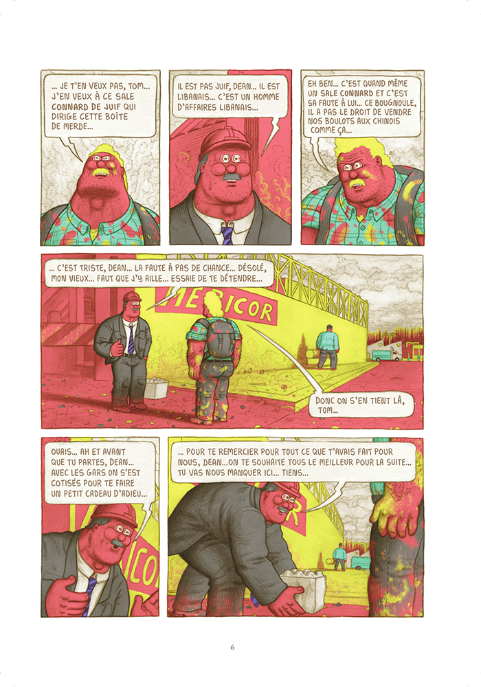 Dean se fait salement lourder de son taf. Une moitié de sa vie consacrée à cette boite qui décide de le larguer comme une vieille chaussette, un pack de bière bon marché en guise de remerciement. Évidemment, Dean accuse le coup. Une partie de l’usine a été transférée en Chine, « mon boulot refilé à un chinetoque ». Dean a fait la guerre du Vietnam, ce qui touche de près ou de loin à l’Asie lui fout la gerbe.