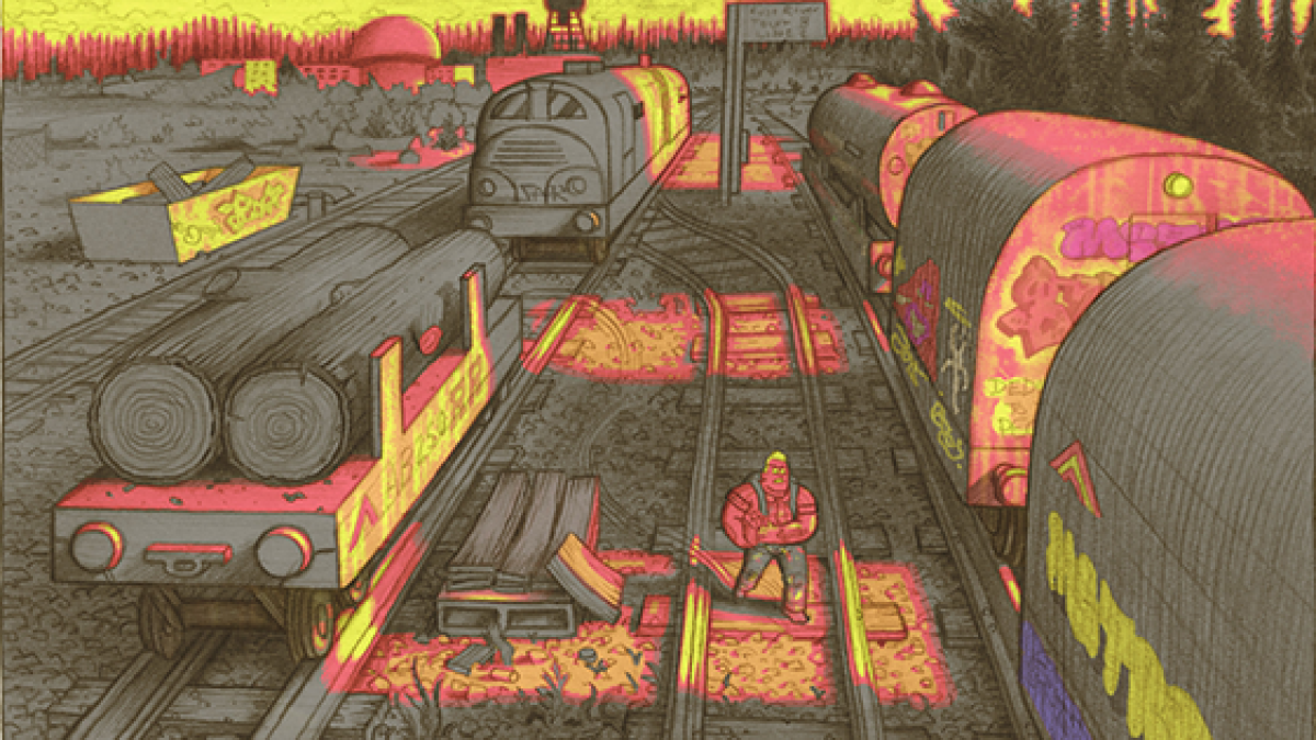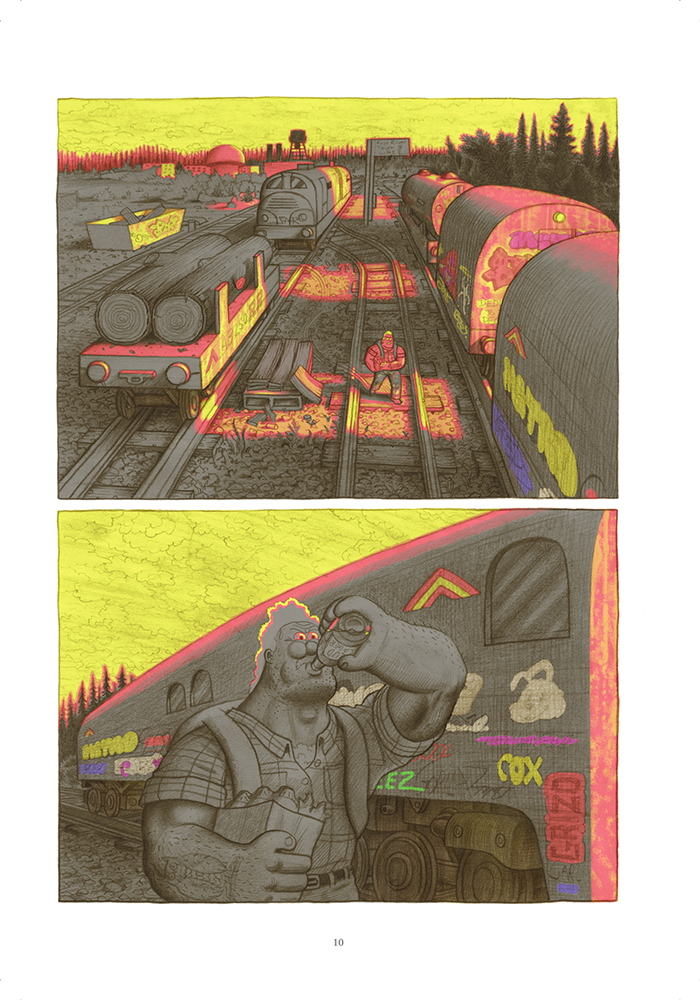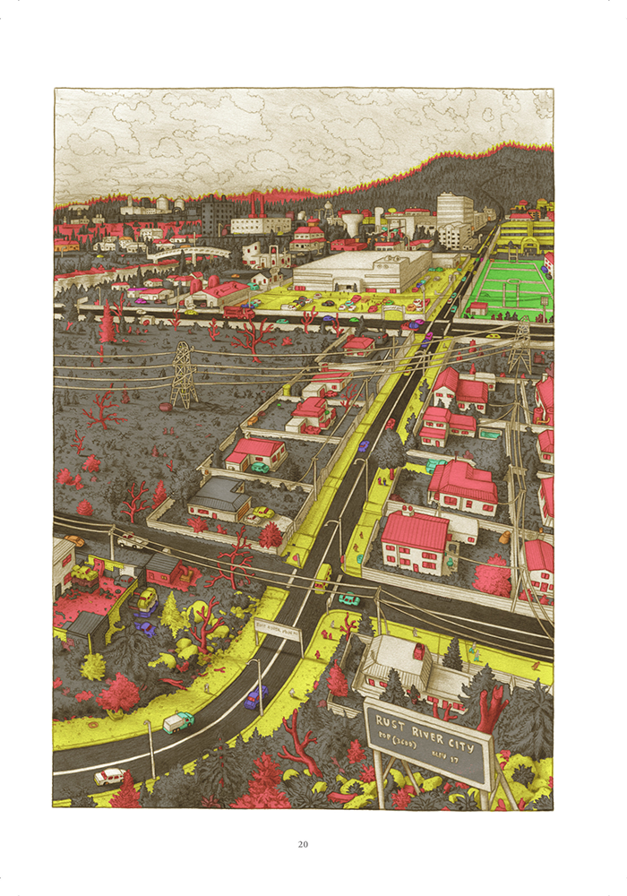 Visuellement, l’auteur de Highbone Theater (sorti il y a bientôt dix ans) troque le noir et blanc de son projet précédent contre des teintes pastel atomiques. L’éventail se pare d’un mélange de rouges brique, jaunes fluo et cyan explosif, opposé au noir des ombres fortes. Un choix qui donne l’impression que la réalité de Rust River City se vit au moment d’un coucher de soleil sans fin, irisant le monde, son ciel, ses arbres d’un halo étrange mais cool et qui termine d’asseoir la dimension surréaliste de l’univers.