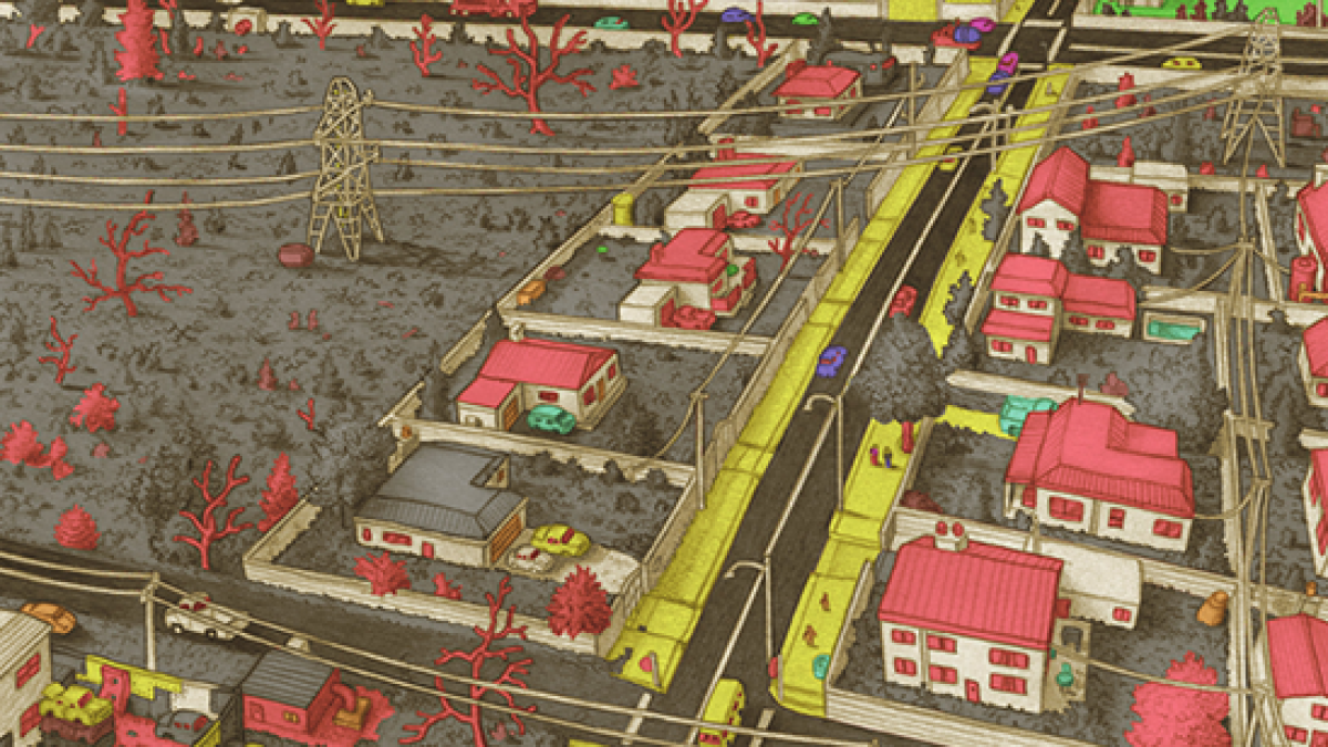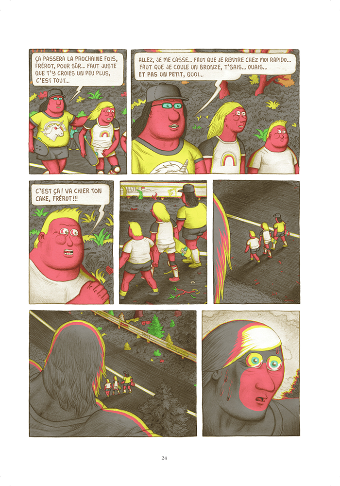 La faune qui compose cette contrée totalement fictive pourrait aussi être celle du roman de Nicolas Mathieu si ce n’est que son humanité est autrement plus proche du cartoon. Elle est pétrie de faciès improbables, dotée d’une carnation vive et d’yeux qui disent une fois sur deux merde à l’autre. Attachante et flippante, on l’imagine avoir été bercée pas loin d’une centrale nucléaire ou d’un centre de tri des déchets défaillant.