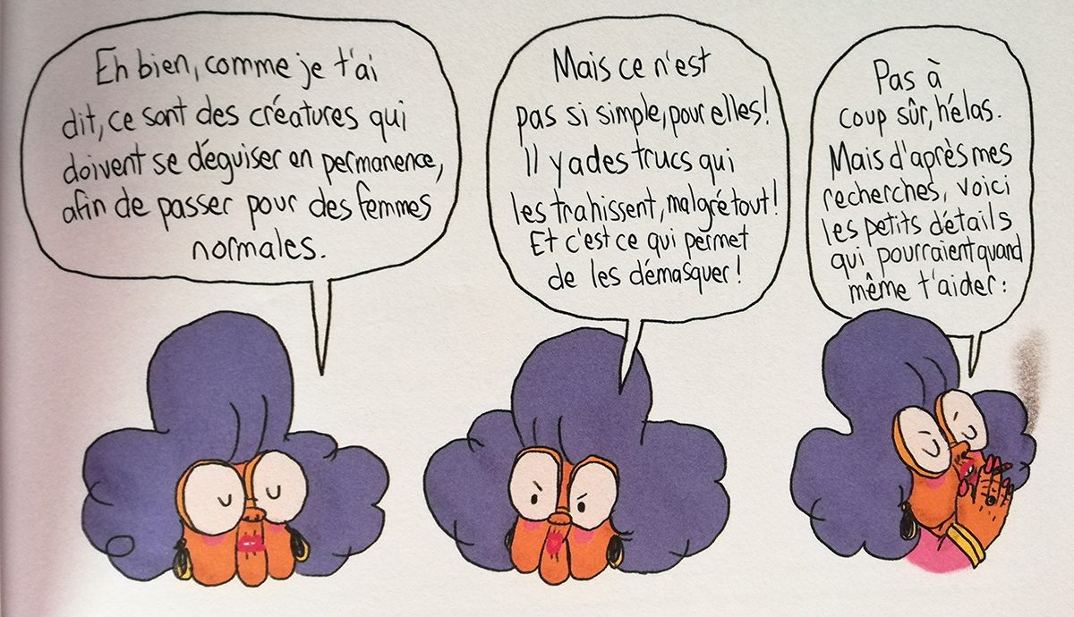 Quelques jours plus tard, la grand-mère poursuivait sa description des sorcières. Elle lui explique qu’elles ne sont pas moches et n’ont pas de nez crochus. Elles prennent toujours l’aspect d’une femme et sont vraiment dangereuses.