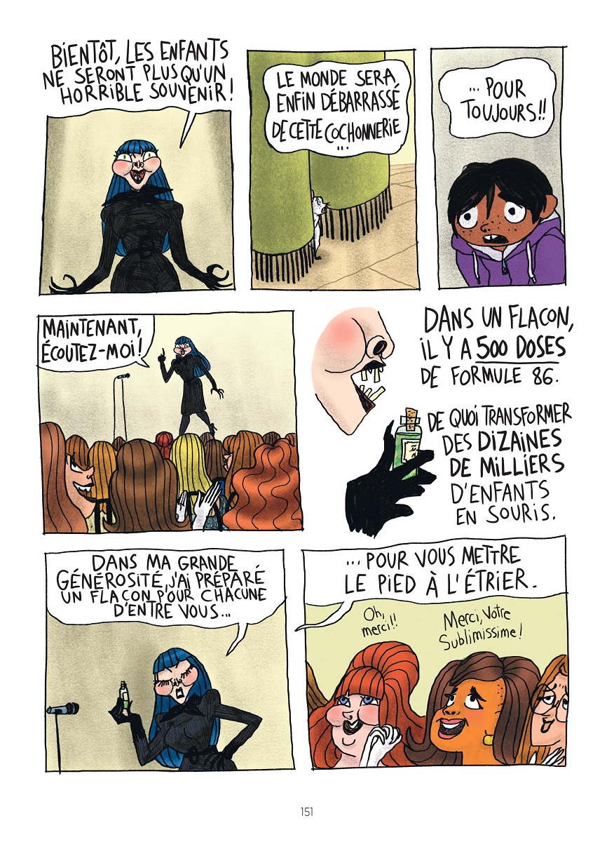 Quant aux sorcières, sous leur allure chic et mondaine, elles sont le mal incarné, moches et effrayantes lorsqu’elles se révèlent. Leur cheffe, Matilda, est proche graphiquement de celle dessinée par Quentin Blake. Difficile de se détacher du maître, on le comprend.