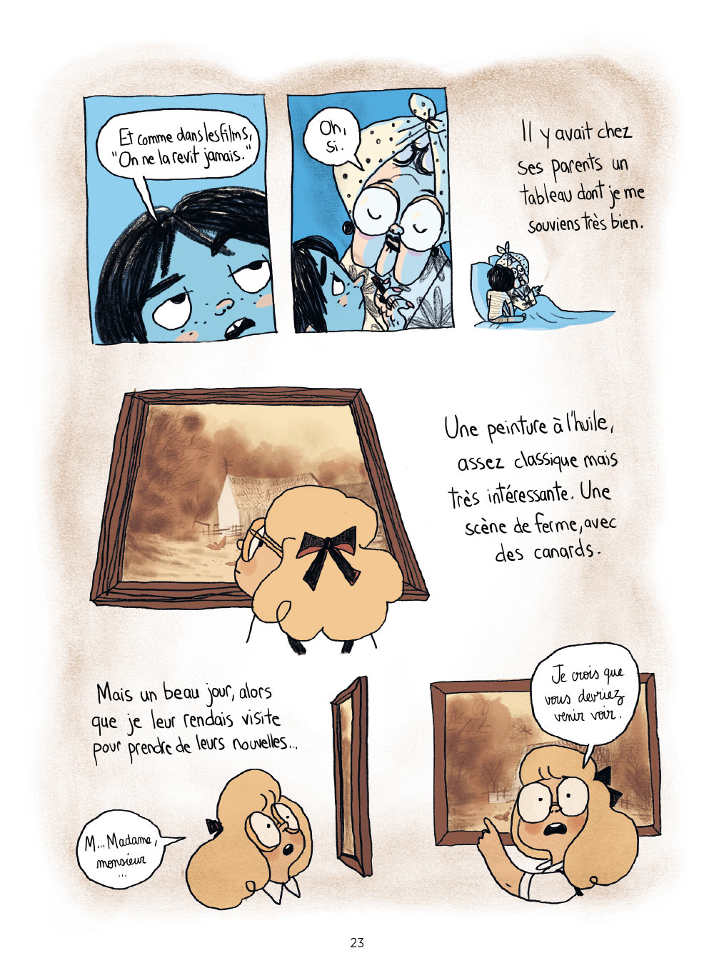 Le lendemain, plus d’amie. Elle avait disparu. Étonnamment, Mamie avait retrouvé son amie dans l’un des tableaux du salon. La fille était réapparue, nourrissant des canards. Elle bougeait, elle était vivante ! Mais dans la toile…