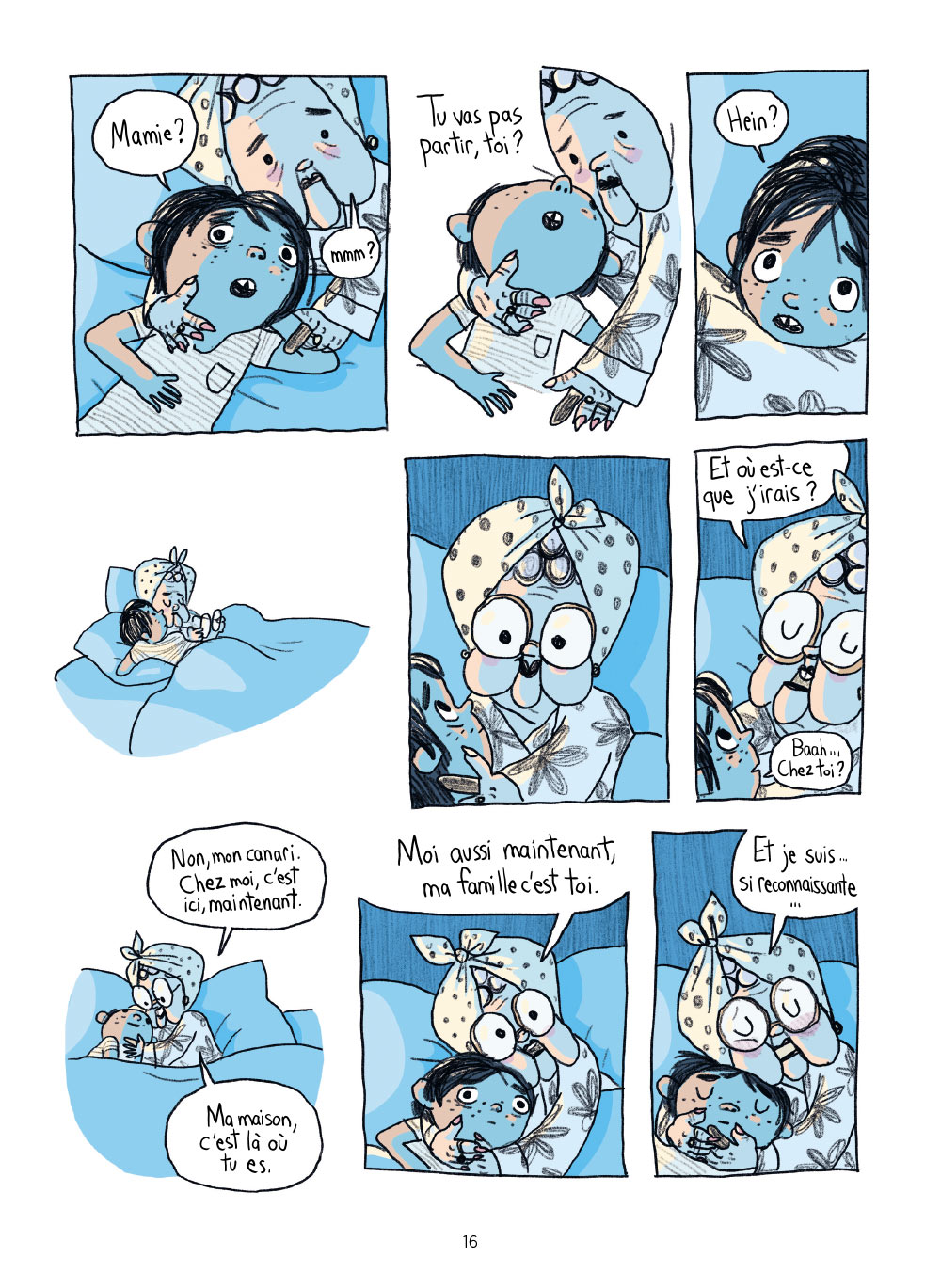 Le soir venu, le garçon rejoint sa grand-mère dans sa chambre. Malgré son immense chagrin, elle tente de faire bonne figure face à son petit-fils et son grand désarroi. Elle le rassure et lui explique qu’à partir d’aujourd’hui, cette maison, ce sera la leur.
