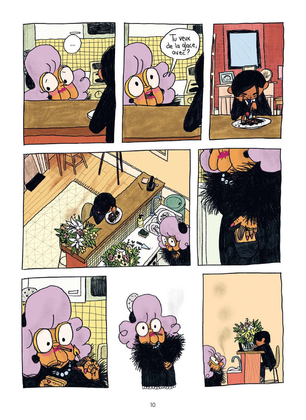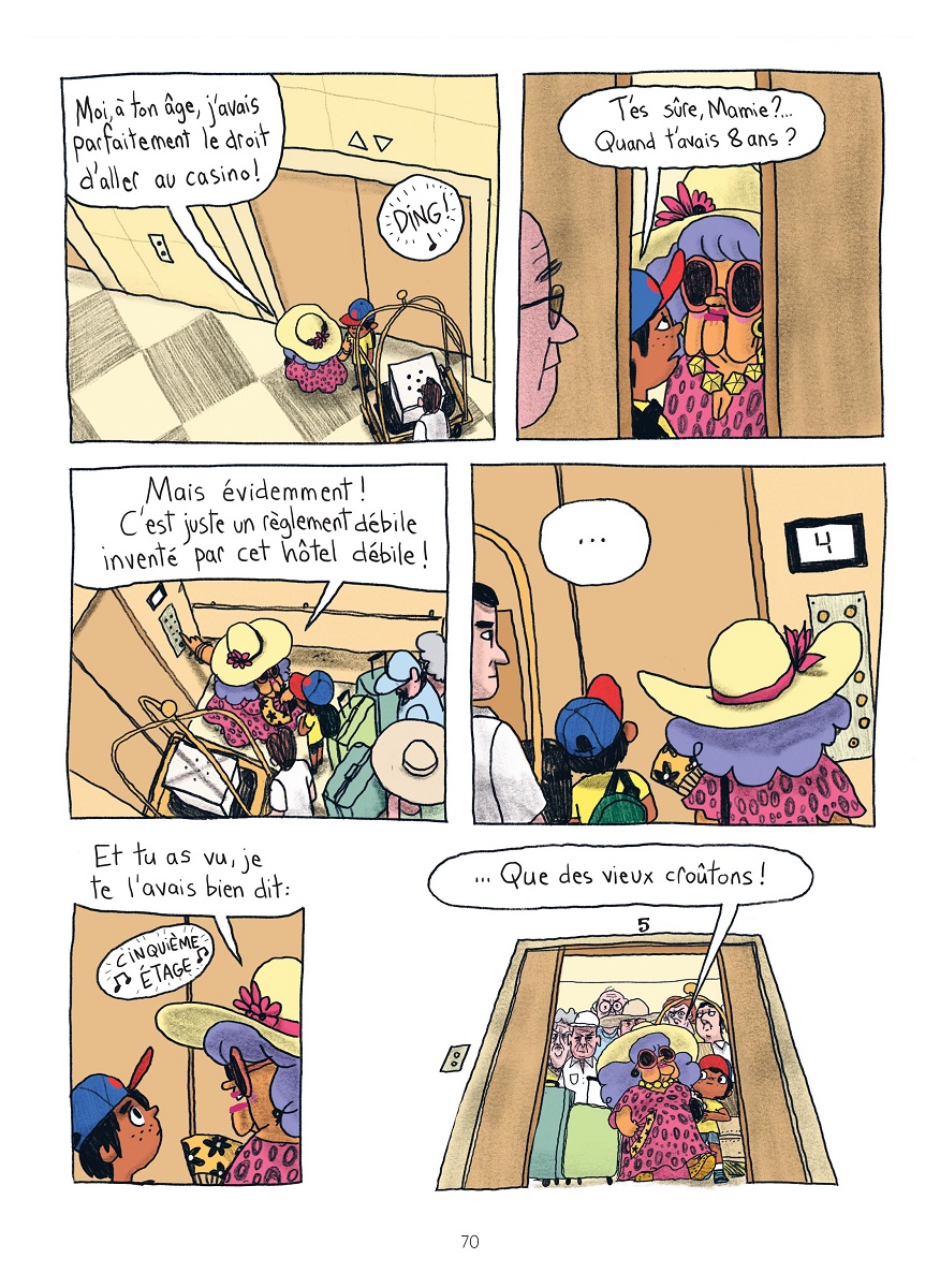 La force de Pénélope Bagieu réside aussi dans son dessin. L’autrice de California Dreamin’in met en image des personnages pour certains attachants et d’autres effrayants. Ainsi, Mamie est merveilleuse. Elle est un mixte de Sylvia Fine, la mère de Fran dans Une nounou d’enfer, la sitcom à succès et sa propre grand-mère. Comme sa collègue de la série américaine, elle a les cheveux violets et fume comme un pompier.