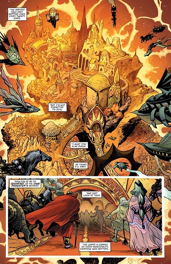 On le sait depuis longtemps, pour créer une grande œuvre, il importe toujours de mêler l’utile à l’agréable. Et dans Sacrifice, ce rôle est rempli par les artistes d’exception que sont Max Fiumara aux dessins et Dave McCaig aux couleurs. L’univers qu’ils créent est absolument somptueux. Et sa richesse est à la hauteur du scénario de Rick Remender. Que ce soit dans la caractérisation des personnages anthropomorphes, dans celle des dieux ou des mondes dans lesquels ils évoluent, rien n’est laissé au hasard. Les détails fourmillent et les sentiments des personnages nous sautent au visage, nous plongeant immédiatement dans ce monde d’heroic-fantasy qui laisse entrevoir un champ des possibles jubilatoire.