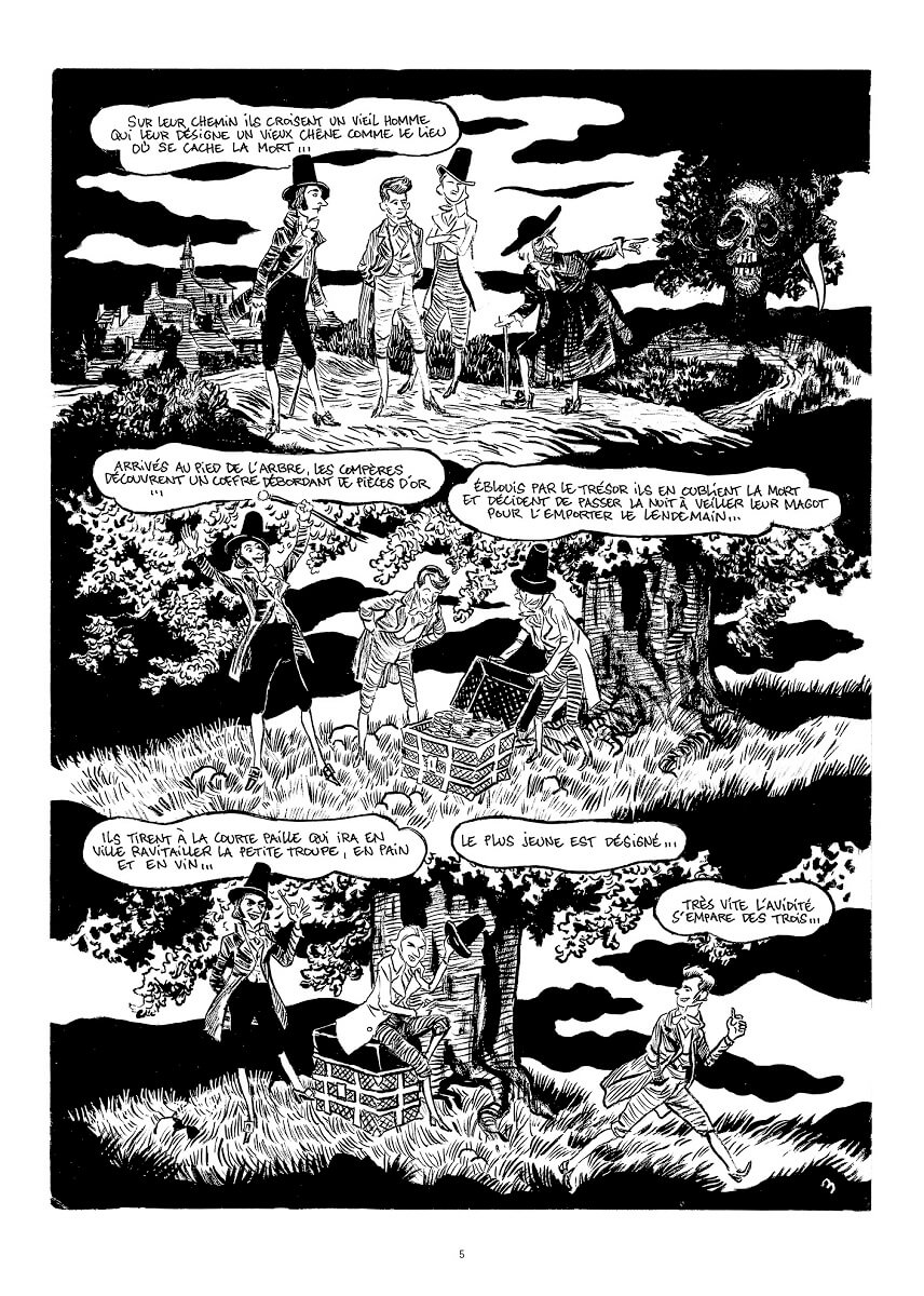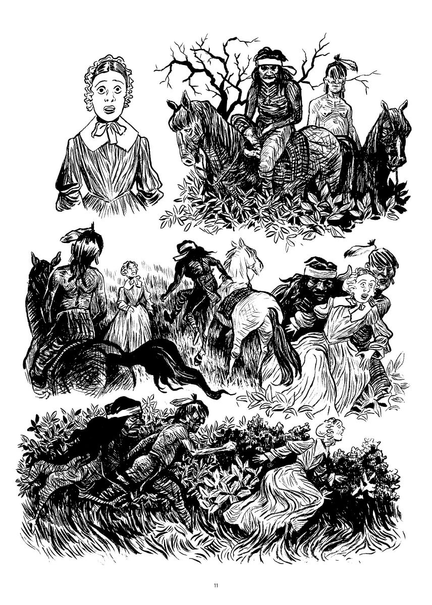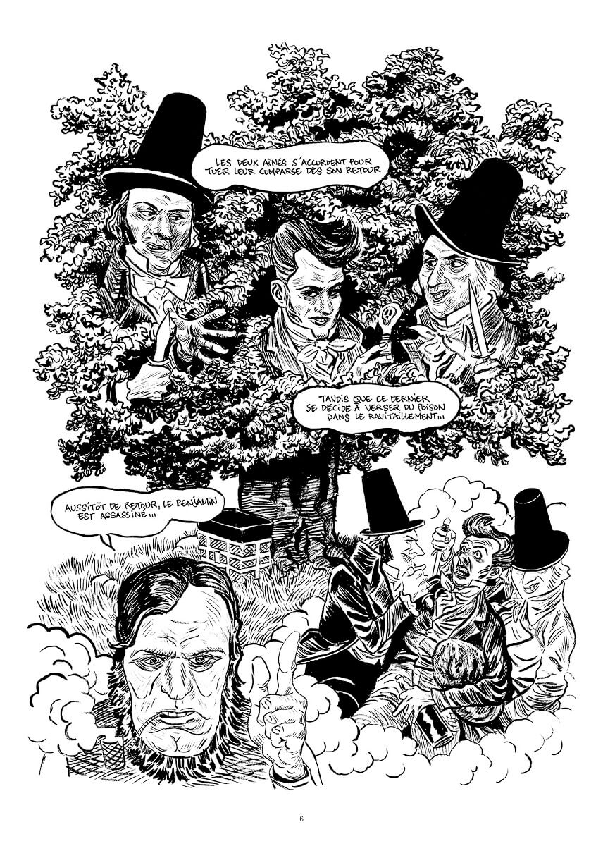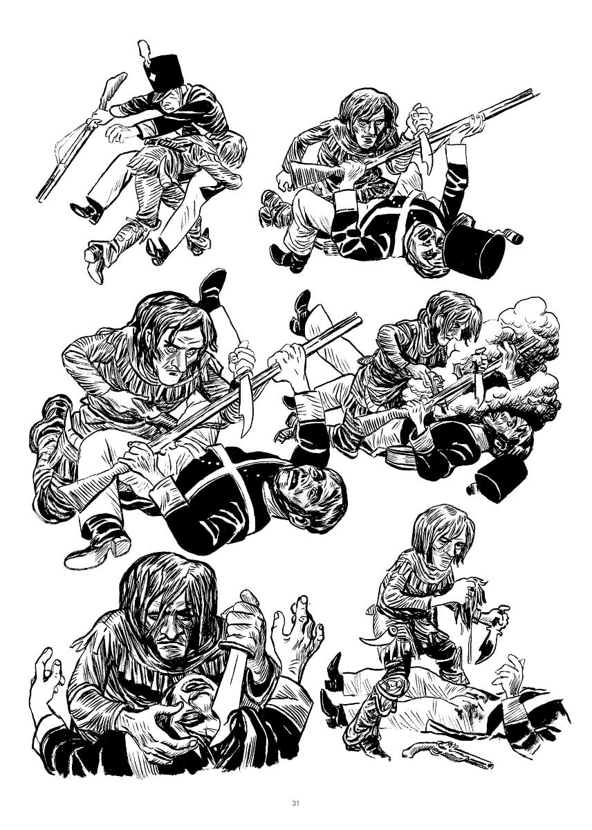 Toute la sauvagerie de cet homme sans foi ni loi est mise magistralement en image par le dessinateur de Bonneval Pacha (3 volumes avec Gwen de Bonneval, Dargaud). Son trait en noir et blanc semi-réaliste est d’une redoutable efficacité. Les planches sans case prennent toute leur force dans un grand format (24×33) pour faire prendre à son récit un tour hallucinant.