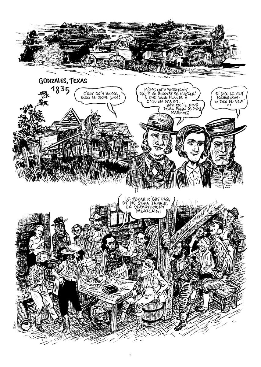 Résumé de l’éditeur : John Glanton (1819-1850) est un Texas Ranger pendant la guerre mexicaine déclenchée en 1845 par l’annexion du Texas par les États-Unis. Les États-Unis annexeront aussi les territoires mexicains de la Californie. Pour Ulysse Grant, qui participa à cette guerre, « La rébellion du Sud fut l’avatar de la guerre avec le Mexique. Nations et individus sont punis de leurs transgressions. Nous reçûmes notre châtiment sous la forme de la plus sanguinaire et coûteuse guerre des temps modernes. » Après la guerre, chassé de l’armée pour meurtre, Glanton devient soldat de fortune, un mercenaire à la tête d’un gang particulièrement violent. Il loue ses services à l’état de Chihuahua afin de chasser les Indiens Apaches qui opèrent à la frontière du Mexique mais massacre aussi des Indiens pacifiques pour se faire plus d’argent. Car Glanton est payé au scalp rapporté. Ses massacres bafouent les traités signés entre ces tribus et les États- Unis et oblige l’état de Chihuahua à les déclarer hors-la-loi. Ils partent vers la Californie où la ruée vers l’or vient de commencer et s’enfoncent de plus en plus dans la violence. Glanton – et sa bande – tombera en 1950 dans une embuscade de la tribu de Quechan qui voulait se venger de leurs exactions. En se basant sur la vie de John Glanton, Texas Ranger pendant la guerre civile mexicaine puis mercenaire à la tête d’une bande de tueurs d’Indiens payés au scalp, Hugues Micol livre un récit hallucinant de la guerre civile mexicaine du milieu de XIXe siècle. Son dessin, puissant, qui rappelle les gravures de Goya, dépeint l’implacable brutalité d’une époque, loin des clichés du Far west.