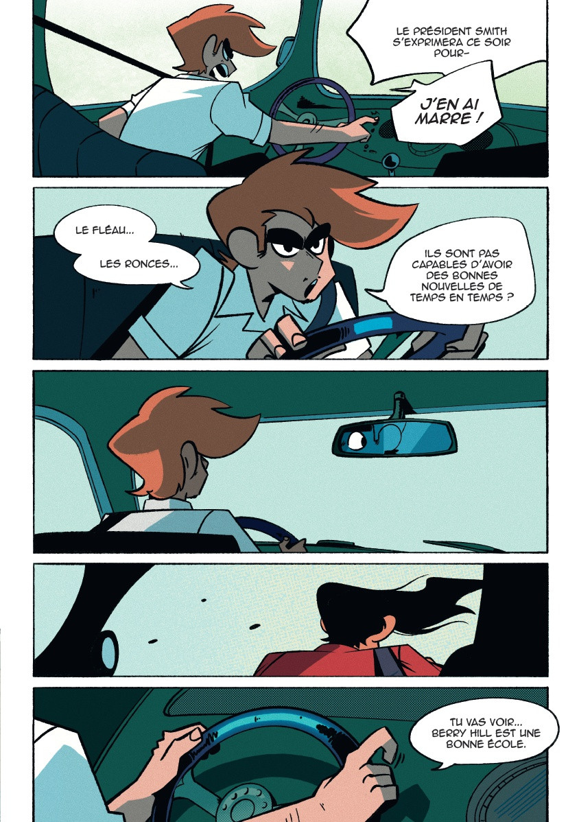 Résumé de l’éditeur : Qui s’y frotte s’y pique Depuis la mort de sa mère, la vie de Sid a basculé. Quand il débarque à Berry Hill, une étrange école nichée dans un vieux château sur la côte, tout semble contre lui : l’année a déjà commencé, les douches sont glacées et… ah oui, des ronces géantes envahissent les salles ! Voilà 50 ans que ces plantes monstrueuses , connues sous le nom du Fléau, ravagent la Frangleterre, défigurant le pays. Malgré ce décor hostile et le poids du deuil, Sid se reconstruira peu à peu au contact de ses nouveaux camarades. Malcolm, le musicien au bras mécanique; Lula, la commère intarissable fan de poésie; et Kate, une fille punk et bagarreuse qui ne mâche pas ses mots. Au même moment, Julian Strokes, un présentateur TV has been tentera de sauver sa carrière. Sa mission ? Découvrir les origines du Fléau ! Ses investigations le mèneront tout droit à Berry Hill… Et si le château avait un lien étroit avec l’origine de ces ronces ? Entre mystères à élucider, concerts sauvages et courses-poursuites entre les épines, Sid et ses amis devront faire preuve de courage pour sauver leur école… et leurs vies !