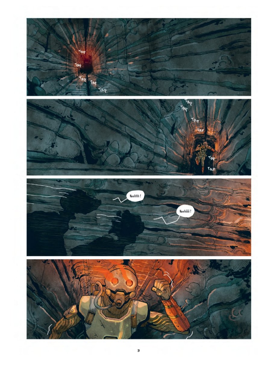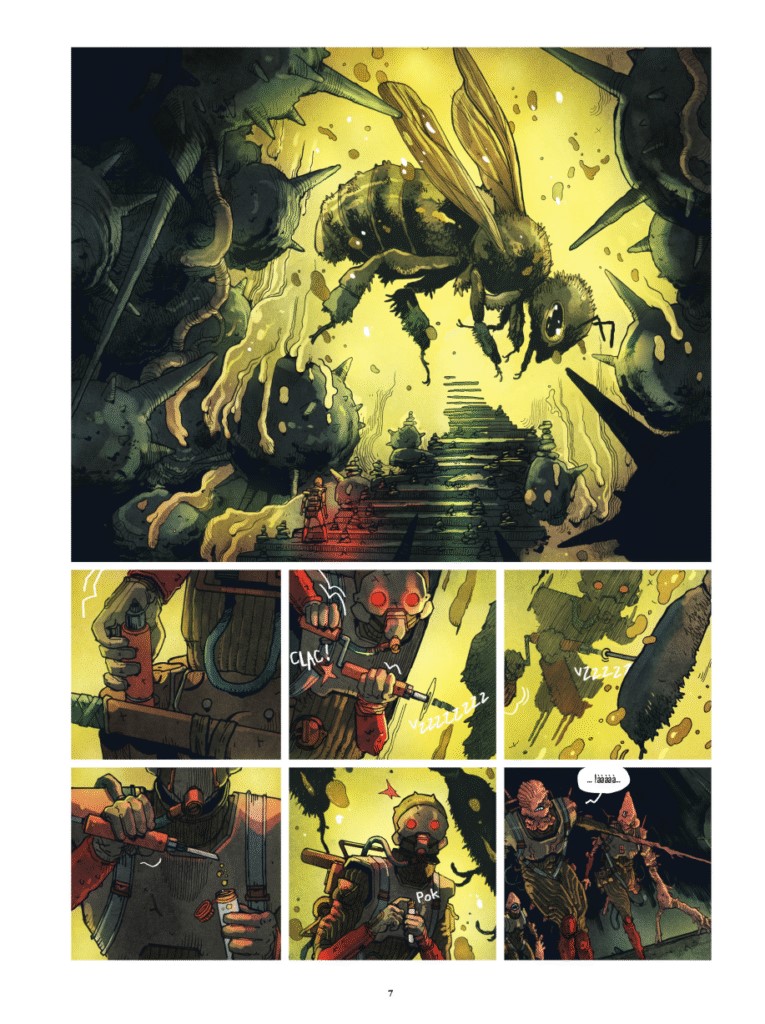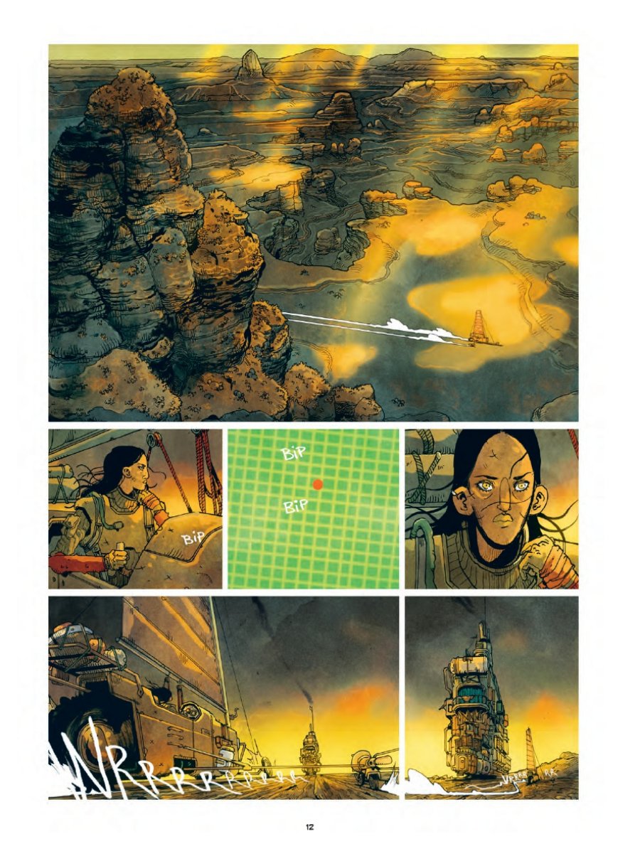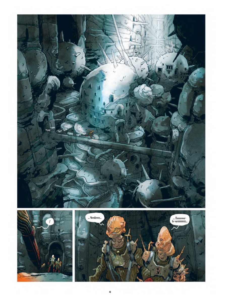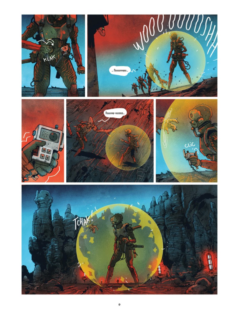Dès les premières pages, le dessinateur impressionne. Mais qu’on ne s’y trompe pas, bien loin d’une esthétique lisse, il s’évertue à créer une ambiance faite d’un ocre jaunâtre au goût ferreux. Ainsi, on est absolument fasciné par certaines doubles pages montrant des décors à couper le souffle, ou des monades au design steam-punk époustouflant. Et petit à petit on se prend au jeu, on se laisse guider par la dynamique créée par une composition de pages extrêmement soignée. On se sent alors comme attiré par cet inconnu qui s’offre à nous, qu’il soit infiniment grand ou infiniment petit.