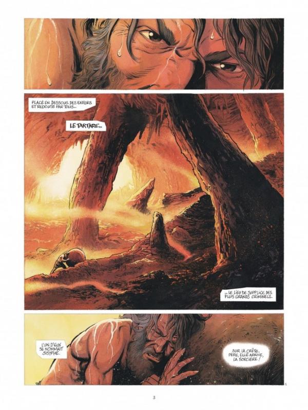 On ignore souvent quelles actions ont conduit à cette punition divine. C’est l’intérêt de cet album que de nous en offrir une version aventurière. C’est comme souvent un récit sombre qui nous est dévoilé. Un innocent qui paye pour les exactions d’un autre. Et la mort qui survient plus qu’il ne devrait. Sisyphe, bien que doté d’un égo trop développé, est surtout un père qui tente de sauver son enfant.