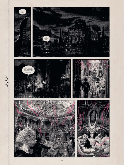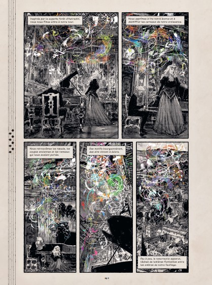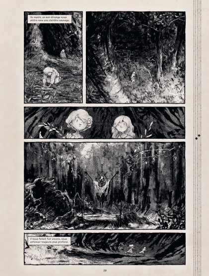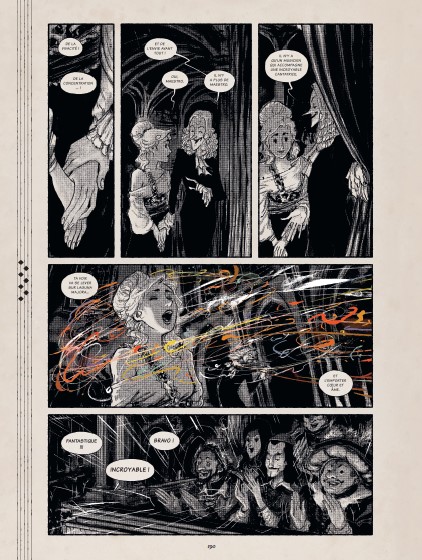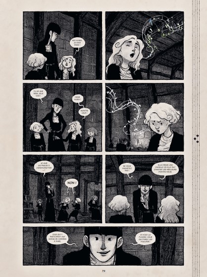 Pour accompagner ce magnifique récit, il fallait que le dessin soit au diapason. Edouard Cour, avec son noir et blanc et ses effets de gravure, tels qu’on pouvait les rencontrer chez l’illustrateur Gustave Doré (1832-1883), a relevé haut la main le défit. Avec son trait d’une finesse extrême, il va dans les moindres détails, comme pour apporter une précision de chef d’orchestre à son dessin. En utilisant des trames de points sur ses fonds, le dessinateur met en avant et modernise la technique du clair-obscur qui sied à merveille à ces temps marqués par un obscurantisme.
