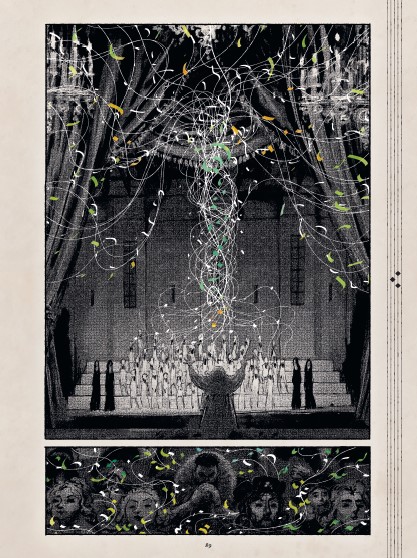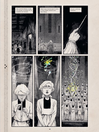 Portées, notes, neumes et volutes sont gravés en or et blanc comme pour mieux apprécier visuellement la richesse de la musique que Soli Deo Gloria va nous donner à découvrir. Le noir profond du fond sera désormais la nuance sur laquelle va s’appuyer ce récit. Les pages de garde, elles-aussi en noir, mat puis brillant, font office de tunnel comme pour mieux passer le barrage du temps et ainsi intégrer un siècle passé, celui du 18e.