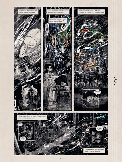 Et par son utilisation parcimonieuse de la couleur, il réussit à matérialiser les sons et la musique. De quelques notes au début de l’album, la couleur emplit de plus en plus la pages, au fur et à mesure que la pratique musicale se fait intensive et professionnelle. Un crescendo de notes et d’arabesques emplit les cases, telle la musique dans la vie d’Hans et Helma.