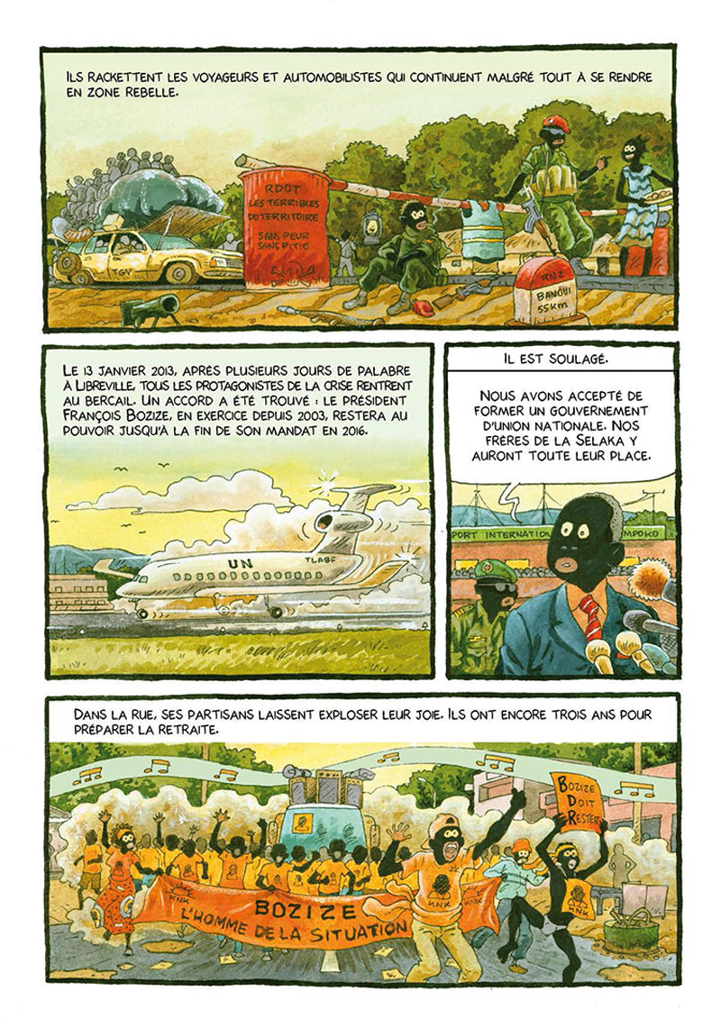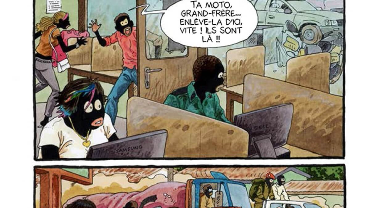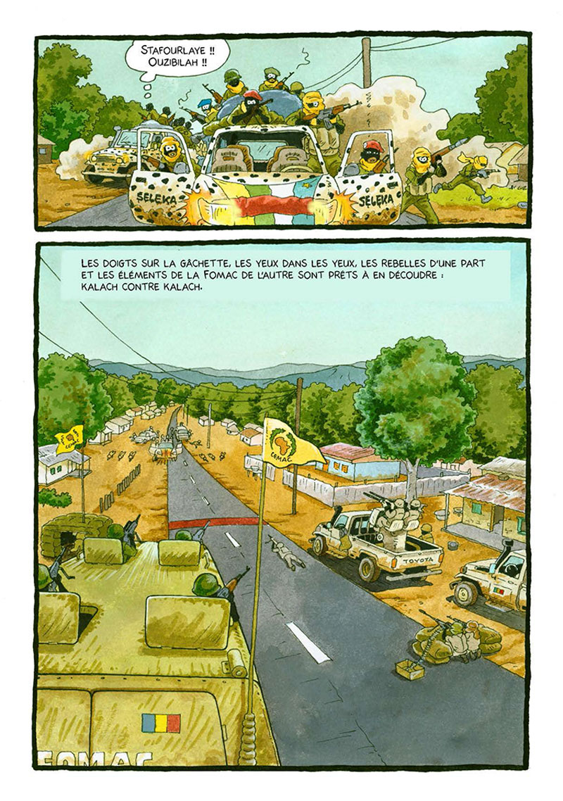 On le voit traversant Bangui, « la ville de la peur », pour porter ses planches à l’éditeur puis se désespérer quand les soldats détruisent tout sur leur passage…