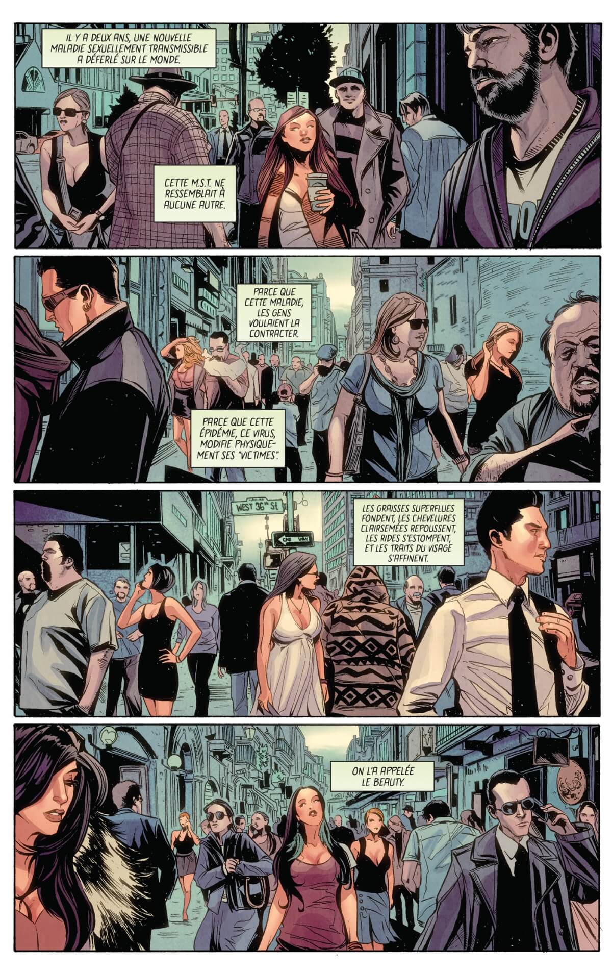 Résumé de l’éditeur : C’est un fait : notre société est obsédée par l’apparence physique. À travers les médias ou la publicité, la beauté nous est imposée comme l’idéal suprême à atteindre. Et s’il y avait un moyen de la garantir éternellement ? Et si ce moyen était une maladie sexuellement transmissible ? Dans un monde où la grande majorité de la population a déjà été « contaminée » par la perfection physique, deux agents du FBI vont enquêter sur les origines de ce mystérieux virus et découvrir que la beauté a un prix… et qu’elle peut vous coûter la vie.
