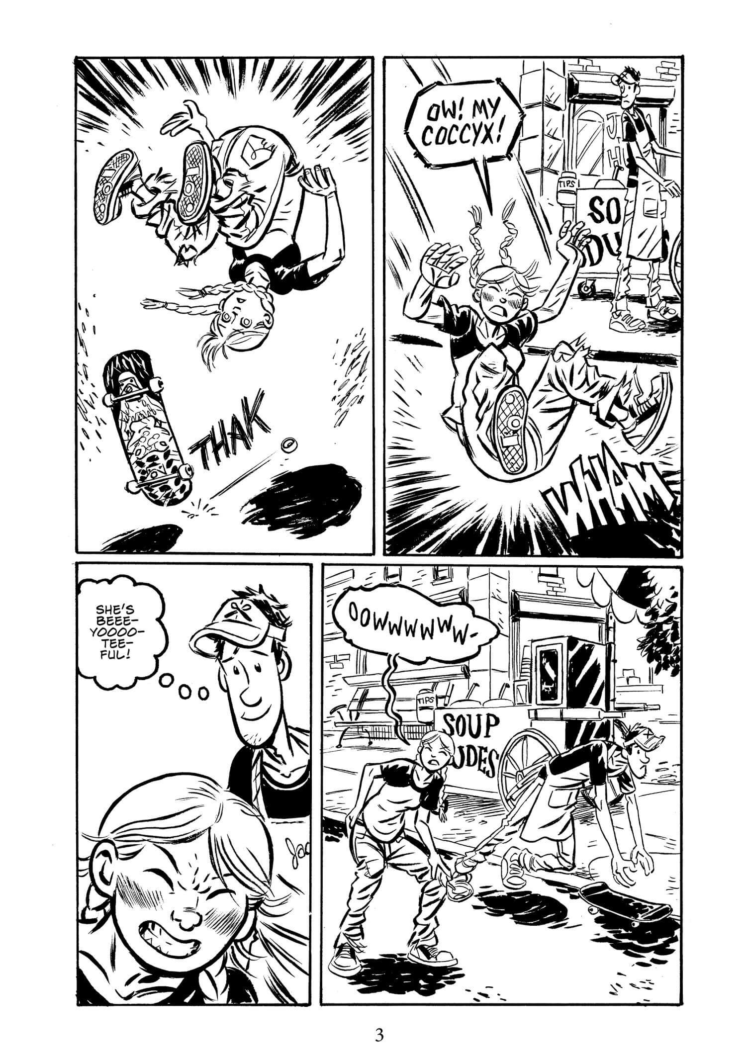 Greg Means et MK Reed imaginent une vraie comédie romantique, drôle, enlevée et très bien écrite. Très en phase avec l’époque actuelle, l’histoire est de ce fait une vraie chronique sociale, critique de nos sociétés actuelles. Si le récit se déroule aux Etats-Unis, celui-ci aurait très bien pu l’être en France, tant il est moderne. En plus de fustiger les réseaux sociaux, le duo de scénaristes laminent aussi tous les préjugés et le machisme ambiant. En effet, les hommes qui entourent Jane, les skateurs ou le colocataire de Jack sont brutes de décoffrage, sans filtre envers les femmes. Ils les prenent de haut, ne pensant pas qu’elle puissent pratiquer ce sport et juste bonnes à donner des conseils de maquillage. Mais ils font de leur héroïne, une femme forte, rembarrant les récalcitrants et cela fait un bien fou.