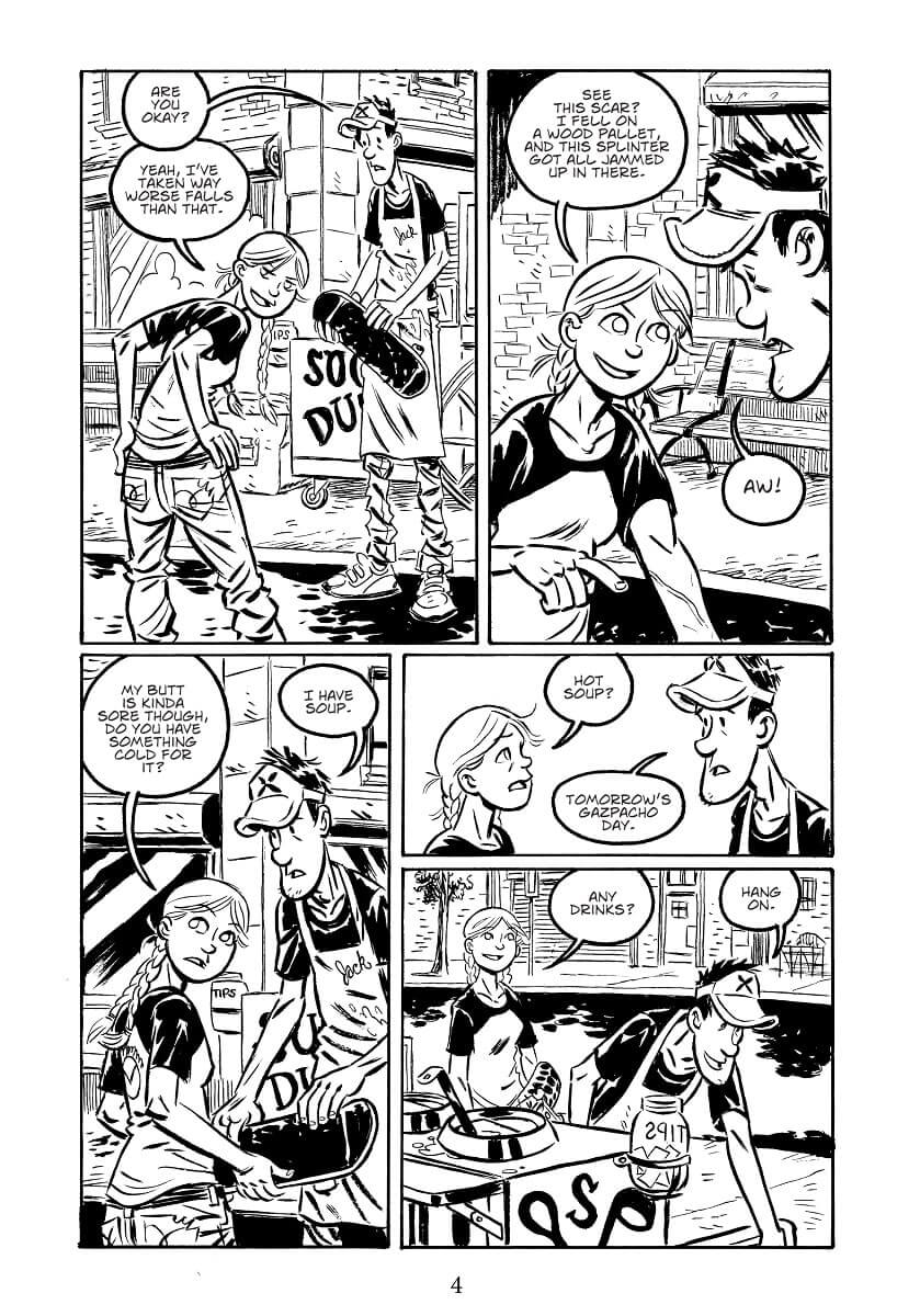 Tout juste arrivée à Brookport, Jane, la vingtaine, a trouvé un travail dans un magasin de skatebord. La jeune femme, elle aussi pratiquante de ce sport, vit en colocation avec 4 jeunes autres filles. Alors qu’elle ride sur la 10e avenue de la ville, elle tombe devant le stand de soupe tenu par Jack. Tel un ange qui atterrit devant lui, Jack tombe sous son charme. Il l’aide à se relever et lui donne un bouteille de thé glacé pour mettre sur ses fesse endolories.