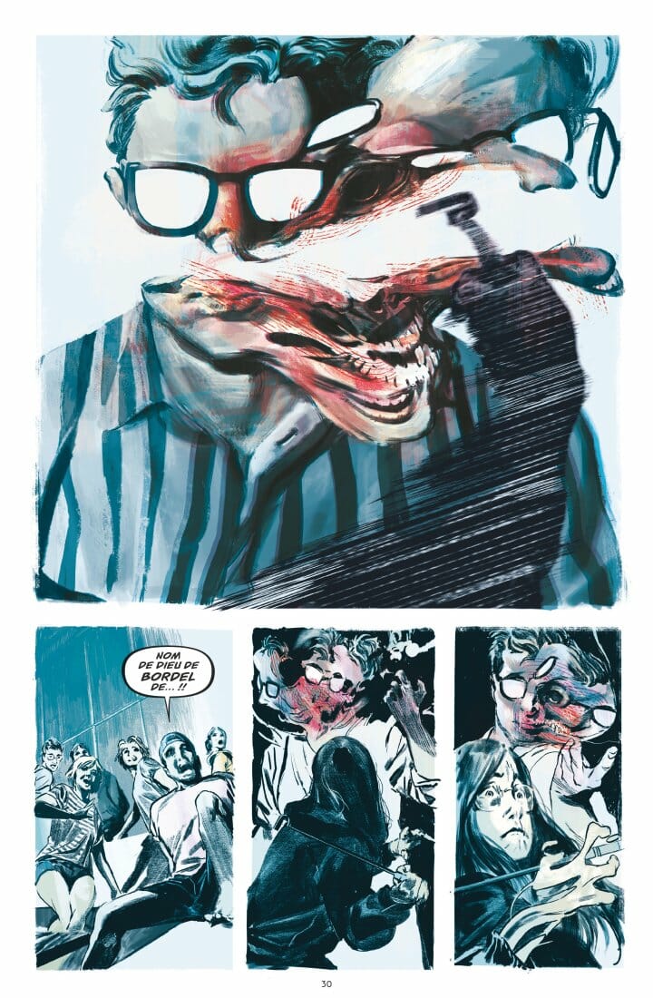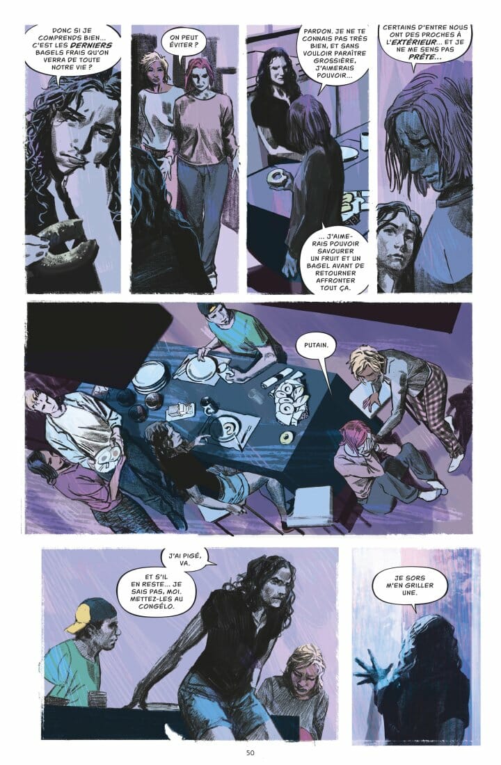 Ses audacieuses compostions de planches créent un dynamisme prodigieux. Et dans un style parfois proche du photoréalisme, il donne vie aux différents personnages en se montrant particulièrement à l’aise pour représenter ce qu’ils ressentent. Dans les yeux des protagonistes, on voit réellement naître puis croître l’angoisse absolue. Soulignons enfin le remarquable travail réalisé par Jordie Bellaire sur la colorisation. Elle accompagne la narration en créant des ambiances envoûtantes. Claires et lumineuses au début, les couleurs employées deviennent rapidement froides et plongent la maison dans un violacé lourd et menaçant.