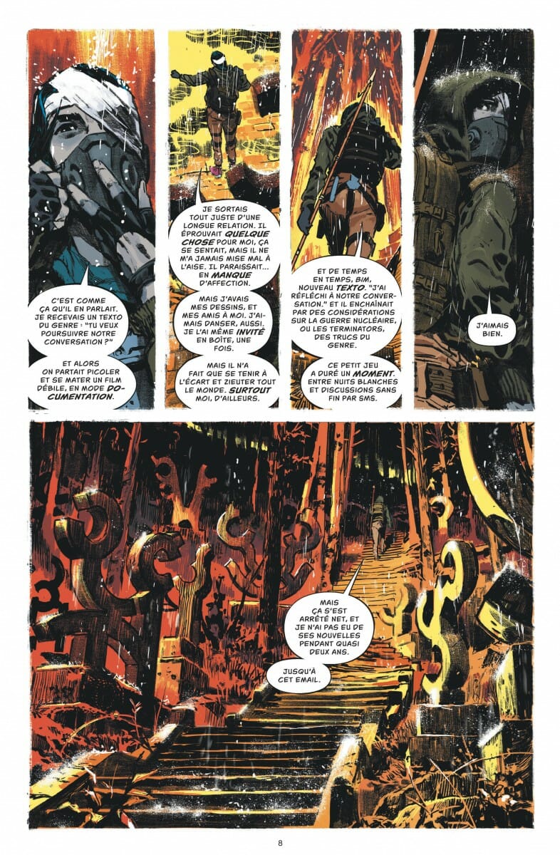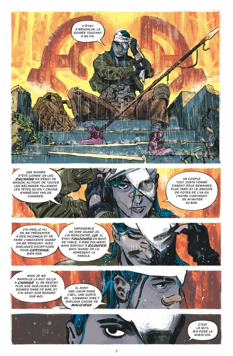 L’exercice de style est complexe et bon nombre d’auteurs s’y sont cassé les dents. Mais force est de constater que James Tynion IV possède désormais la maturité pour relever le défi. En effet, il nous plonge littéralement au cœur de l’histoire. Et au même titre que les personnages, le lecteur découvre, se questionne et veut comprendre. Mais le maître du jeu veille à ne dévoiler ses cartes qu’à point nommé. Et distillant les indices d’une main de maître, page après page, il fait monter la tension. Et le fait est que rarement une œuvre a autant perturbé. On a réellement l’impression d’être aux côtés des personnages. Et à la recherche de la moindre information, on relit régulièrement les premières pages et on décortique la moindre prise de parole, le moindre signe. L’immersion est donc totale, et les dessins d’Álvaro Martínez Bueno y sont pour beaucoup.