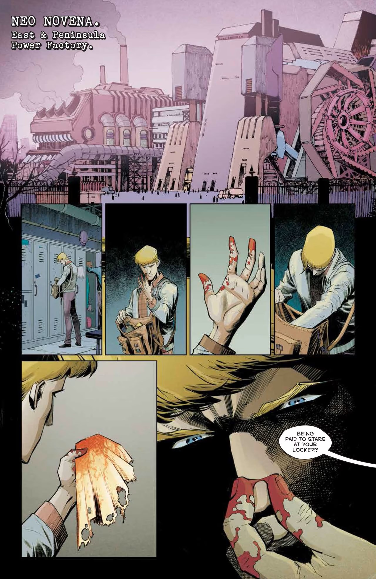 Dès les premières pages, on est frappé par l’ambiance glauque et sombre qui se dégage des dessins de Laurence Campbell. La narration particulièrement soignée de Ram V nous plonge immédiatement dans les ruelles mal famées de Neo Novena.