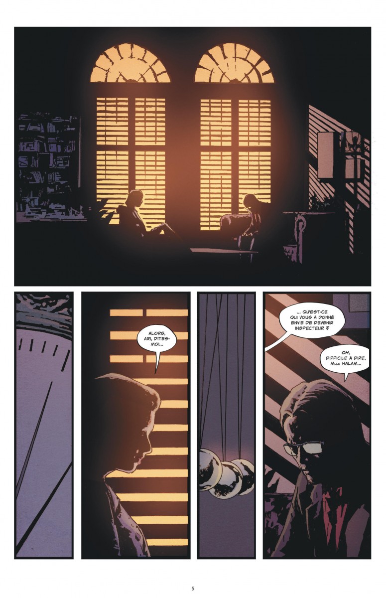 Ainsi, aux côtés de l’inspecteur Ari, on suit avec intérêt cette enquête qui s’annonce trépidante. Dans la plus pure tradition des polars noirs, cet anti-héros taciturne et bougon entend bien mener à son terme une enquête qu’il considère comme celle de sa vie. Et force est de constater que le lecteur se prend lui aussi au jeu. Désireux de comprendre, on relève avec attention chaque information, à l’affût du moindre indice. Et pourtant, au moment même où on est pris dans le tourbillon de l’intrigue, on passe à autre chose. De nouveaux personnages, des dessins différents et une ambiance inquiétante dans les trois premières pages, puis étonnamment plus claire.