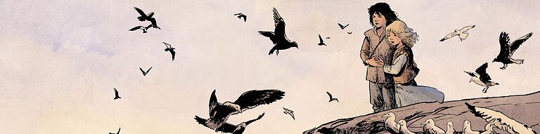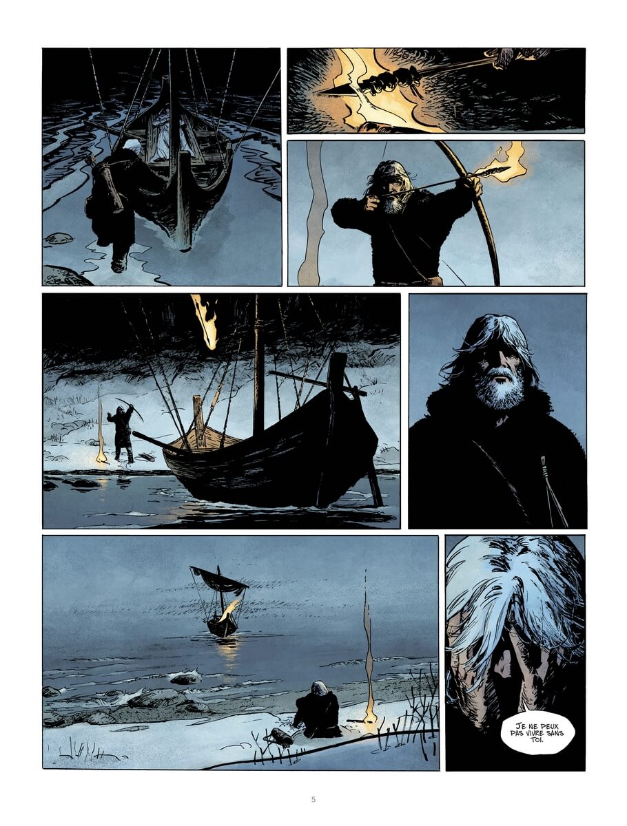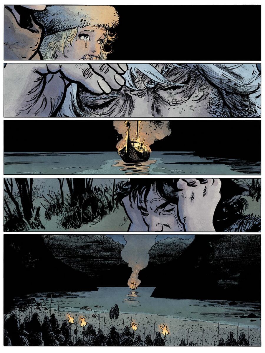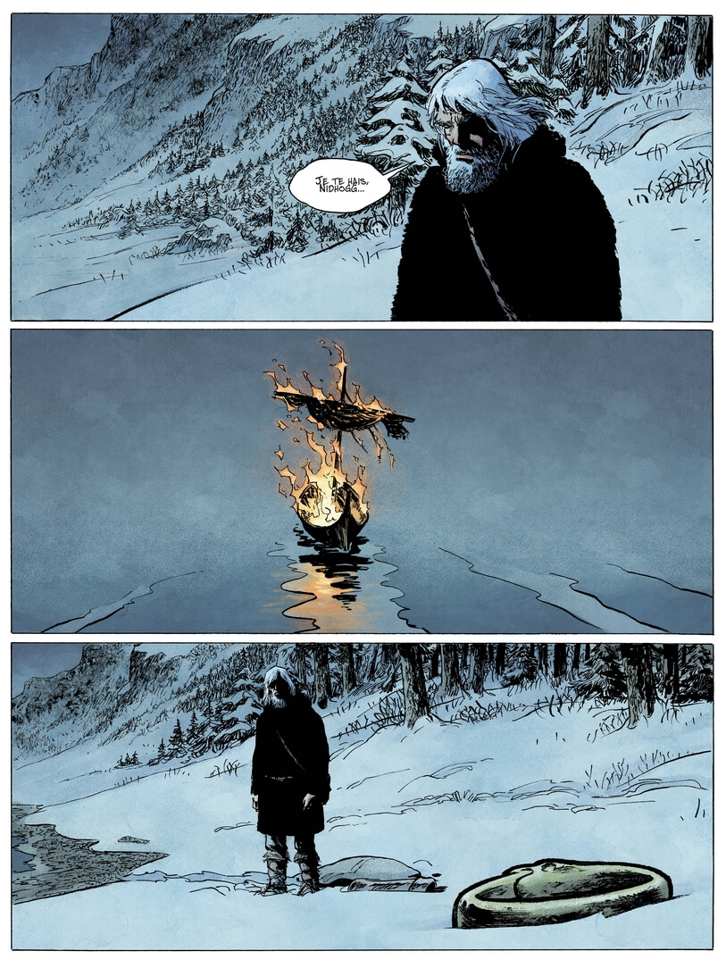 La première page d’Adieu Aaricia pourrait sonner comme un bel hommage à celle dessinée il y a plus de quarante ans dans La Magicienne Trahie. Mais quoi de plus logique que de débuter cette aventure à l’endroit même où nous avions rencontré pour la première fois Thorgal dans une fâcheuse posture. L’anneau des sacrifiés a résisté à l’usure du temps. L’homme qu’on distingue assez pour attester son âge avancé, s’en souvient avec amertume. A bord de son bateau de fortune, Thorgal accompagne l’amour de sa vie pour son dernier voyage.