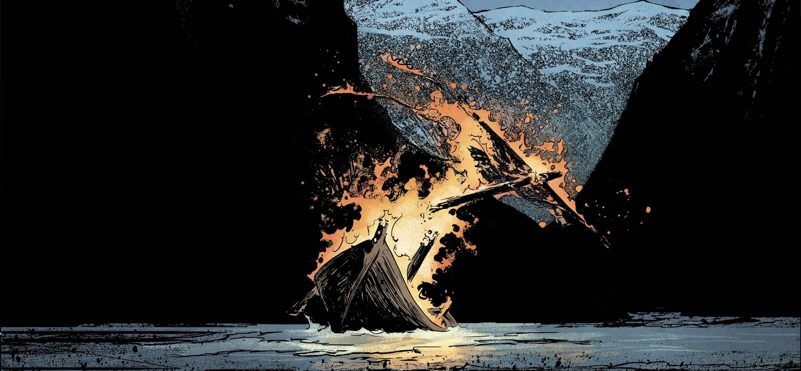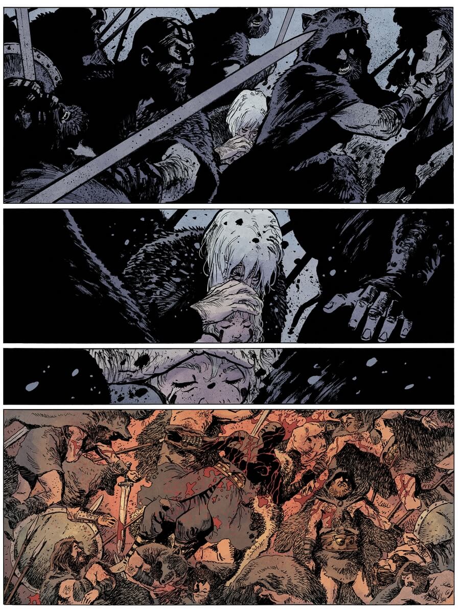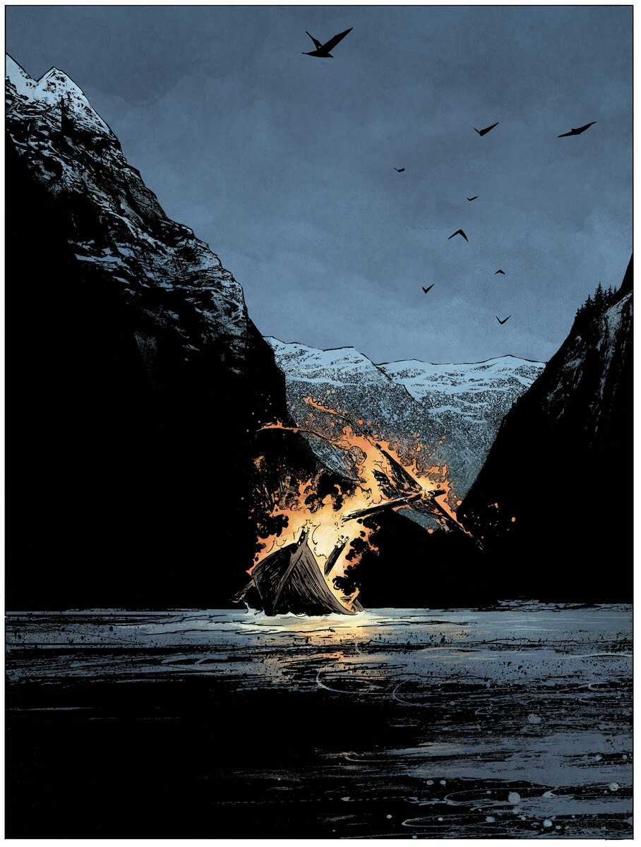 La première page d’Adieu Aaricia pourrait sonner comme un bel hommage à celle dessinée il y a plus de quarante ans dans La Magicienne Trahie. Mais quoi de plus logique que de débuter cette aventure à l’endroit même où nous avions rencontré pour la première fois Thorgal dans une fâcheuse posture. L’anneau des sacrifiés a résisté à l’usure du temps. L’homme qu’on distingue assez pour attester son âge avancé, s’en souvient avec amertume. A bord de son bateau de fortune, Thorgal accompagne l’amour de sa vie pour son dernier voyage.